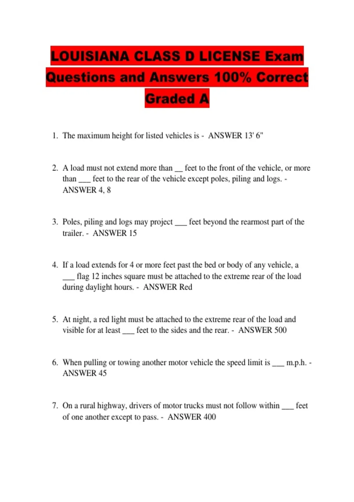 LOUISIANA CLASS D LICENSE Exam Questions and Answers 100% Correct Graded A 1. The maximum height for listed vehicles is - ANSWER 13' 6" 2. A load must not extend more than __ feet to the front of the vehicle, or more than ___ feet to the rear of the vehicle except poles, piling and logs. - ANSWER 4, 8 3. Poles, piling and logs may project ___ feet beyond the rearmost part of the trailer. - ANSWER 15 4. If a load extends for 4 or more feet past the bed or body of any vehicle, a ___ flag 12 inches square must be attached to the extreme rear of the load during daylight hours. - ANSWER Red 5. At night, a red light must be attached to the extreme rear of the load and visible for at least ___ feet to the sides and the rear. - ANSWER 500 6. When pulling or towing another motor vehicle the speed limit is ___ m.p.h. - ANSWER 45 7. On a rural highway, drivers of motor trucks must not follow within ___ feet of one another except to pass. - ANSWER 400 8. Also, high beam headlights must be dimmed no less than ____ feet from oncoming traffic, and ___ feet of a vehicle being followed. - ANSWER 500, 200 9. Vehicles transporting passengers for hire must be equipped with at least a ___ type fire extinguisher. - ANSWER 2-BC 10. Passenger buses and freight carrying vehicles must carry all of the following: - ANSWER Three Flares, Two 12-inch square red cloth flags, Three electric lanterns 11. Trucks carrying explosive, flammable liquid, compressed gases or using compressed gas as a fuel must use _______ or ________ only. - ANSWER red electric lanterns, red emergency reflectors 12. If your brakes should fail on the level road, you should _______, and use engine compression to slow down. - ANSWER downshift 13. A rear view mirror must reflect a view of the highway for a distance of ___ feet to the rear regardless of the load of the vehicle. - ANSWER 200 14. Tail lights must be visible for ___ feet to the rear. - ANSWER 1,000 15. Reflectors must be visible for ___ feet. - ANSWER 600 16. Class D license is for anyone driving a vehicle or combined set of vehicles in this weight range _____, as long as they are not carrying hazardous materials - ANSWER 10,001-26,001 pounds 17. A Class D license allows for a driver-for-fire to drive any vehicle fitting into the Class __ requirements - ANSWER E 18. you must be ____ years old to receive a class D license - ANSWER 17 19. the maximum width for all vehicles except buses is ___ - ANSWER 8 feet 20. the maximum width for buses is ____ - ANSWER 8ft 6in 21. the load may not project more than ___ beyond the width of the body - ANSWER 6in 22. the maximum height for all vehicles is ___ - ANSWER 13ft 6in 23. the maximum length for any single vehicle including its load is ___ - ANSWER 40ft 24. the maximum length for a truck-tractor and trailer combination is ___ - ANSWER 65ft 25. the maximum height, length, and width requirements do not apply to ____, ______, or ____ as long as they are operating during daylight - ANSWER auto carriers, trailers hauling poles or pilings, trailers hauling logs 26. when securing a load, the contents must not be allowed to ____, ____, _____, or ______ and the cover must be securely fastened - ANSWER drop, shift, leak, otherwise escape 27. any load may not extend more than ____ in front of the vehicle - ANSWER 4ft 28. any load except for poles, pilings, and logs may not extend more than ___ beyond the rear of the vehicle - ANSWER 8ft 29. poles, pilings, and logs may not extend more than ___ beyond the rear of the trailer - ANSWER 15ft 30. if a load extends more than ___ past the body of the vehicle a 12 in square _____ must be attached to the load during daylight and a ____ must be attached during nighttime - ANSWER 4 ft, red flag, red light 31. the red light attached to the load at night must be visible from ____ - ANSWER 500ft 32. when pulling or towing another motor vehicle the speed limit is _____ - ANSWER 45 mph 33. the speed limit for school buses which are frequently stopping to load or unload children is ___ - ANSWER 35mph 34. for all other vehicle, where the posted speed limit permits, the maximum speed limit is ___ - ANSWER 70mph