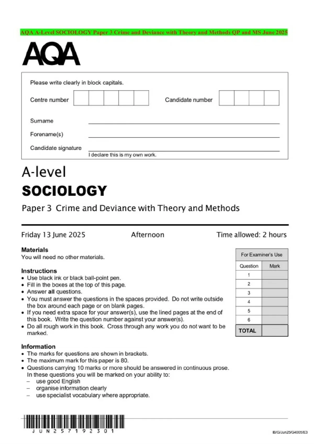 AQA A-Level SOCIOLOGY Paper 3 Crime and Deviance with Theory and Methods QP and MS June 2025