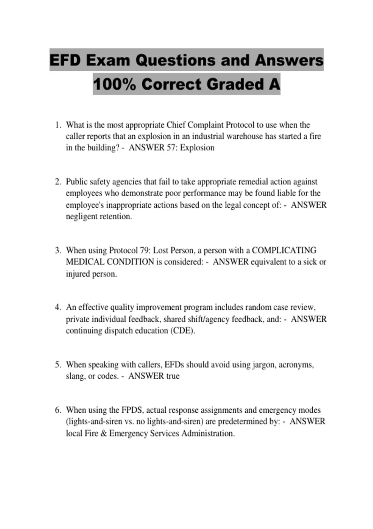 EFD Exam Questions and Answers 100% Correct Graded A 1. What is the most appropriate Chief Complaint Protocol to use when the caller reports that an explosion in an industrial warehouse has started a fire in the building? - ANSWER 57: Explosion 2. Public safety agencies that fail to take appropriate remedial action against employees who demonstrate poor performance may be found liable for the employee's inappropriate actions based on the legal concept of: - ANSWER negligent retention. 3. When using Protocol 79: Lost Person, a person with a COMPLICATING MEDICAL CONDITION is considered: - ANSWER equivalent to a sick or injured person. 4. An effective quality improvement program includes random case review, private individual feedback, shared shift/agency feedback, and: - ANSWER continuing dispatch education (CDE). 5. When speaking with callers, EFDs should avoid using jargon, acronyms, slang, or codes. - ANSWER true 6. When using the FPDS, actual response assignments and emergency modes (lights-and-siren vs. no lights-and-siren) are predetermined by: - ANSWER local Fire & Emergency Services Administration. 7. One of the Key Questions on Protocol 61 is "How much has spilled/leaked?" If an EFD is unsure about which alternative word is more appropriate, s/he is allowed to read this question as "How much has spilled or leaked?" - ANSWER true 8. The caller reports that two elevator maintenance workers are trapped under an elevator car and they are both injured. What is the most appropriate Determinant Code? - ANSWER 56-D-2 9. The caller reports that a chemical storage tank is on fire outside. What is the best Chief Complaint Protocol? - ANSWER 80: Outside Tank Fire The caller reports that a car is on fire. Key Questioning finds: the vehicle is inside a freestanding PARKING GARAGE the car is a two-door coupe the fire is not threatening anything one person is injured 10. What is the most appropriate Determinant Code? - ANSWER 71-C-2X 11. The caller reports finding a 50-gallon drum in an empty field that he believes may contain hazardous waste. Key Questioning finds: chemical marking labels worn away and unreadable nothing has spilled/leaked no one is injured 12. What is the most appropriate Determinant Code? - ANSWER 61-A-1 13. When not obvious, EFDs must ask if a fire has been extinguished. - ANSWER false 14. The Gap Theory suggests that: - ANSWER t "gaps" during the calltaking process can elevate caller anxiety. 15. What is the most appropriate Chief Complaint Protocol to use when the caller reports that his commercial fishing boat is taking on water in COASTAL water, but he thinks he can make it back to the dock? - ANSWER 73: Watercraft in Distress/Collision 16. What is the most appropriate Chief Complaint Protocol to use when the caller reports that a vehicle is on fire inside a parking structure that is attached to a residential apartment building? - ANSWER 69: Structure Fire 17. What is the most appropriate Chief Complaint Protocol to use when the caller reports that her climbing partner is currently trapped on a small ledge halfway up a 50-foot cliff in a remote, mountainous area? - ANSWER 62: High Angle Rescue 18. What is the most appropriate Chief Complaint Protocol to use when the caller reports that a freight train has derailed and caught fire? - ANSWER 70: Train and Rail Collision/Derailment 19. What is the most appropriate Chief Complaint Protocol to use when a caller reports that lightning has started a WILDLAND fire near her remote cabin? - ANSWER Protocol 82: Vegetation/Wildland/Brush/Grass Fire 20. What is the most appropriate Chief Complaint Protocol to use when the caller reports that hazardous materials have caught fire aboard a cargo ship? - ANSWER 64: Marine/Boat Fire 21. According to the Vehicle in Floodwater (Caller Inside) instructions on Protocol A, what is the best way to help children escape from a vehicle in floodwater? - ANSWER Callers should start with the oldest child and get the children on top of the roof before climbing to the roof themselves. 22. Which of the following lists contains the four elements necessary to prove negligence in a court of law? - ANSWER duty, breach of duty, damage, causation 23. The caller reports that he is stranded in his car in floodwater. In response to the Case Entry Question "Is the water moving the vehicle or getting deeper inside the vehicle?" the caller reports that the water is moving the vehicle. What should you do next? - ANSWER Initiate dispatch for an 81-E-2 "Vehicle in floodwater (threatened)" response. 24. The caller is trapped in a building fire. You are providing instructions from Panel 2b on Protocol B: Building Evacuation and Health/Life Safety. The caller responds that there are no exterior windows (that lead to the outside) in the room. What is the next PAI you should provide? - ANSWER "Hold your hand against any interior wall that leads to another room." 25. Upon recognizing a fireground communication breakdown, the EFD should: - ANSWER intervene to ensure the correct message is rec