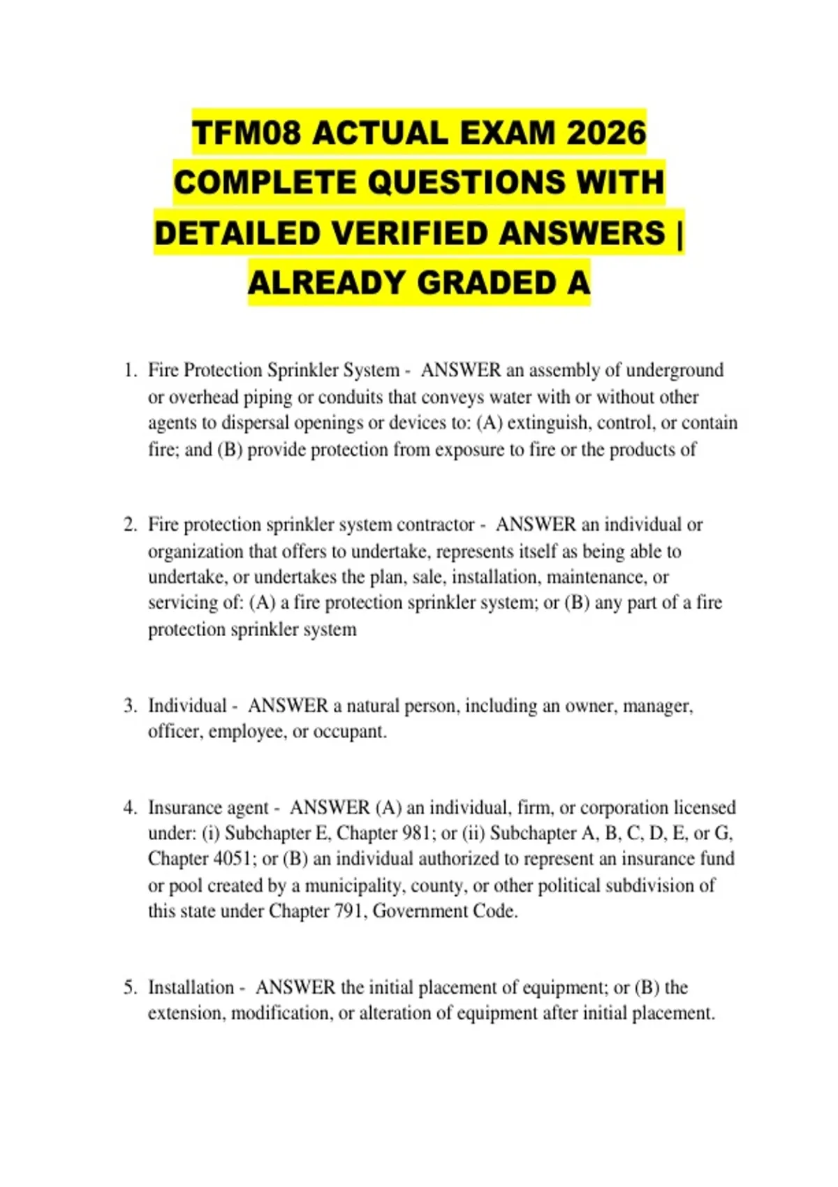 TFM08 ACTUAL EXAM 2026 COMPLETE QUESTIONS WITH DETAILED VERIFIED ANSWERS | ALREADY GRADED A 1. Fire Protection Sprinkler System - ANSWER an assembly of underground or overhead piping or conduits that conveys water with or without other agents to dispersal openings or devices to: (A) extinguish, control, or contain fire; and (B) provide protection from exposure to fire or the products of 2. Fire protection sprinkler system contractor - ANSWER an individual or organization that offers to undertake, represents itself as being able to undertake, or undertakes the plan, sale, installation, maintenance, or servicing of: (A) a fire protection sprinkler system; or (B) any part of a fire protection sprinkler system 3. Individual - ANSWER a natural person, including an owner, manager, officer, employee, or occupant. 4. Insurance agent - ANSWER (A) an individual, firm, or corporation licensed under: (i) Subchapter E, Chapter 981; or (ii) Subchapter A, B, C, D, E, or G, Chapter 4051; or (B) an individual authorized to represent an insurance fund or pool created by a municipality, county, or other political subdivision of this state under Chapter 791, Government Code. 5. Installation - ANSWER the initial placement of equipment; or (B) the extension, modification, or alteration of equipment after initial placement. 6. License - ANSWER document issued to a responsible managing employee authorizing the employee to engage in the fire protection sprinkler system business in this state. 7. Maintenance - ANSWER the maintenance of a fire protection sprinkler system or any part of a fire protection sprinkler system in the condition of repair that provides performance as originally planned. 8. Organization - ANSWER a corporation, a partnership or other business association, a governmental entity, or any other legal or commercial entity. 9. Registration certificate - ANSWER the document issued to a fire protection sprinkler system contractor authorizing the contractor to engage in business in this state 10. Responsible managing employee - ANSWER an individual designated by a company that plans, sells, installs, maintains, or services fire protection sprinkler systems to ensure that each fire protection sprinkler system, as installed, maintained, or serviced, meets the standards for the system as provided by law. 11. Service - ANSWER maintenance, repair, or testing 12. Section 6003.002 Applicability of Chapter - ANSWER (a) This chapter does not apply to: (1) an employee of the United States, this state, or any political subdivision of this state who acts as a fire protection sprinkler system contractor for the employing governmental entity; (2) the plan, sale, installation, maintenance, or servicing of a fire protection sprinkler system in any property owned by the United States or this state; (3) an individual or organization acting under court order as authorization; (4) an individual or organization that sells or supplies products or materials to a registered fire protection sprinkler system contractor; (5) an installation, maintenance, or service project for which the total contract price for labor, materials, and all other services is less than $100, if: (A) the project is not a part of a complete or more costly project, whether the complete project is to be undertaken by one or more fire protection sprinkler system contractors; or (B) the project is not divided into contracts of less than $100 for the purpose of evading this chapter; (6) an engineer licensed under Chapter 1001, Occupations Code, acting solely in the engineer's professional capacity; (7) a regular employee of a registered fire protection sprinkler system contractor; or (8) an owner or lessee of property that: (A) installs a fire protection sprinkler system on the owned or leased property for the owner's or lessee's own use or for family members' use; and (B) does not offer the property for sale or lease before the first anniversary of the date of installation of the fire protection sprinkler system. (b) This chapter does not authorize an individual or organization to practice professional engineering other than in compliance with Chapter 1001, Occupations Code 13. Section 6003.003 Effect on Local Regulation - ANSWER (a) This chapter and the rules adopted under this chapter have uniform force and effect throughout this state. A municipality or county may not enact an order, ordinance, or rule requiring a fire protection sprinkler system contractor to obtain a registration certificate from the municipality or county. A municipality or county may not impose on a fire protection sprinkler system contractor qualification or financial responsibility requirements other than proof of a registration certificate. (b) Notwithstanding any other provision of this chapter, a municipality or county may require a fire protection sprinkler system contractor to obtain a permit and pay a permit fee for the installation of a fire protection sprinkler system and require the installation of a fire protection sprinkler system to conform to the building code or other construction requirements of the municipality or county. (c) A municipal or county order, ordinance, or rule in effect on September 1, 1983, is not invalidated because of any provision of this chapter. 14. Section 6003.051 Administration of Chapter - ANSWER (a) The department shall administer this chapter. (b) The commissioner may issue rules necessary to administer this chapter through the state fire marshal. 15. Section 6003.052 Adoption of Rules - ANSWER (a) In adopting necessary rules, the commissioner may use recognized standards, including standards: (1) adopted by federal law or regulation; (2) published by a nationally recognized standards-making organization; or (3) developed by individual manufacturers. (b) Under rules adopted under Section 6003.051(b), the department may create a specialized licensing or registration program for fire protection sprinkler system contractors. 16. Section 6003