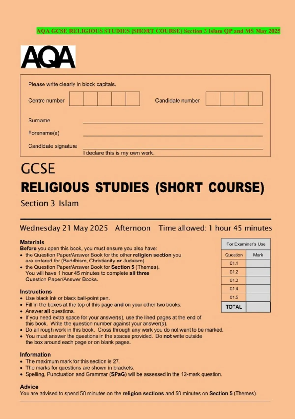 AQA GCSE RELIGIOUS STUDIES (SHORT COURSE) Section 3 Islam QP and MS May 2025