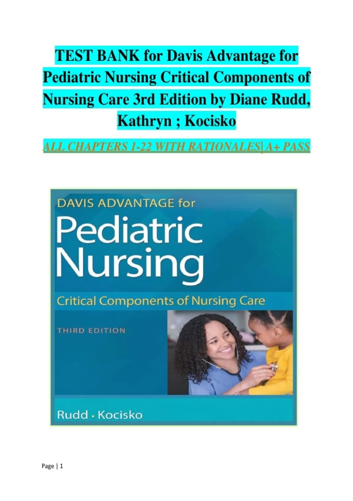 Davis Advantage for Pediatric Nursing: Critical Components of Nursing Care 3rd Edition by Kathryn Rudd & Diane Kocisko. Comprehensive test bank aligned to the textbook structure covering core pediatric nursing principles, assessment, clinical judgment, developmental care, common childhood illnesses, family-centered practice and home care topics across all chapters (Unit 1 to Unit 4 and appendixes). This edition emphasizes pediatric growth and development, psychosocial and cultural assessment, care of common disorders, and effective clinical decision-making for nursing students preparing for professional exams. ISBN: 9781719645706 1 Pediatric Nursing: An Overview 2 Issues and Trends in Pediatric Nursing 3 Standards of Practice and Ethical Considerations 4 Psycho-Social-Cultural Assessment of the Child and the Family 5 Growth and Development of the Child 6 Newborns and Infants 7 Toddlers and Preschoolers 8 School-Age Children 9 Adolescents 10 Common Illnesses or Disorders in Childhood and Home Care 11 Respiratory Disorders 12 Cardiovascular Disorders 13 Neurological and Sensory Disorders 14 Mental Health Disorders 15 Gastrointestinal Disorders 16 Renal Disorders 17 Endocrine Disorders 18 Reproductive and Genetic Disorders 19 Hematological, Immunological, and Neoplastic Disorders 20 Musculoskeletal Disorders 21 Dermatological Diseases 22 Appendixes