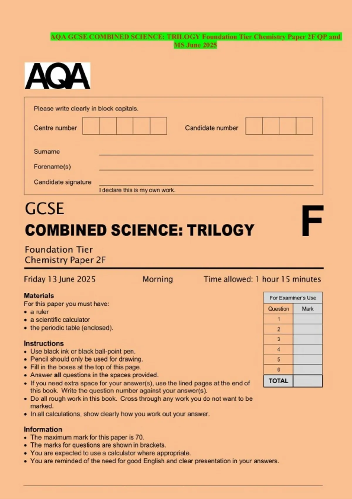 AQA GCSE COMBINED SCIENCE: TRILOGY Foundation Tier Chemistry Paper 2F QP and MS June 2025