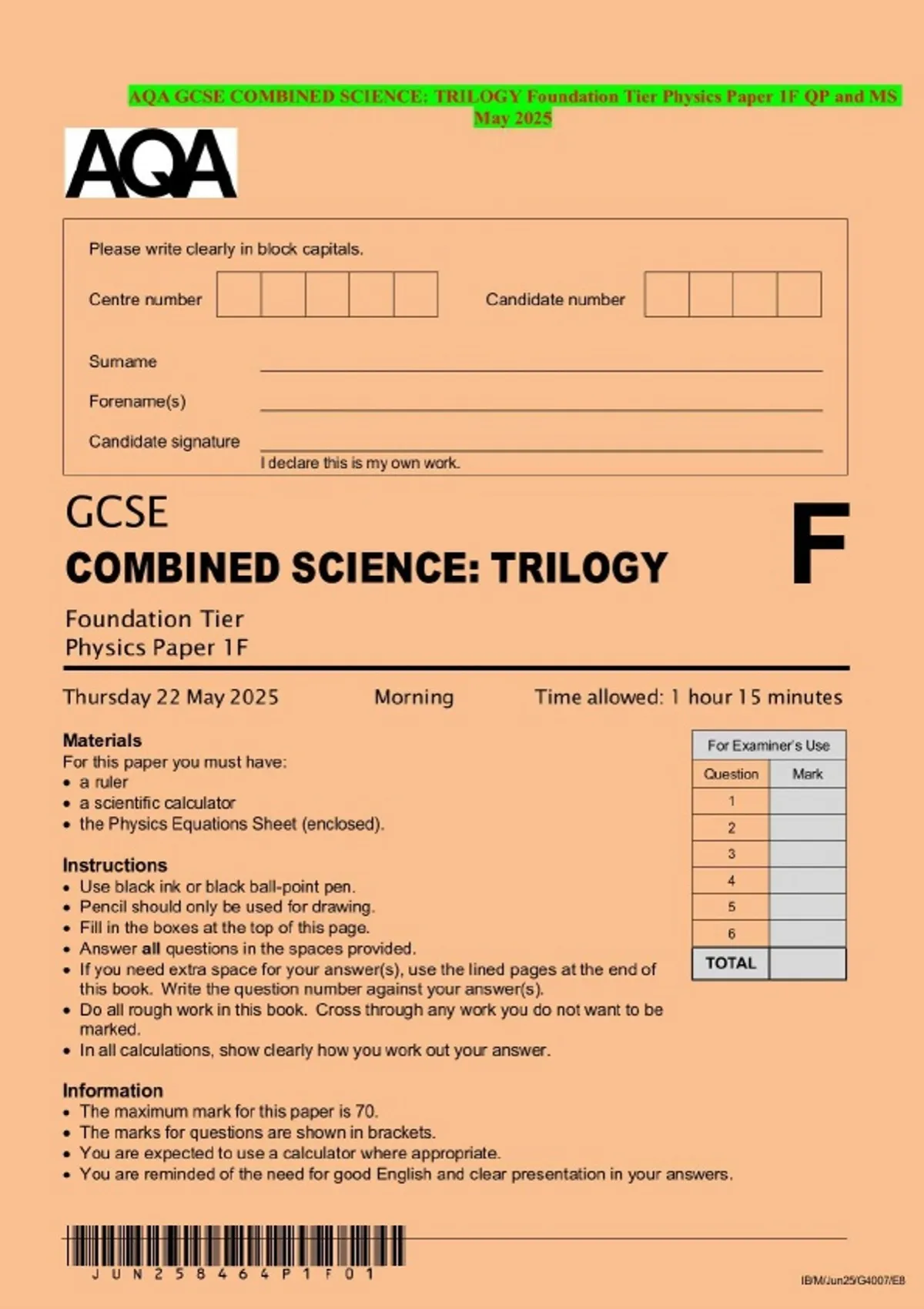 AQA GCSE COMBINED SCIENCE: TRILOGY Foundation Tier Physics Paper 1F QP and MS May 2025