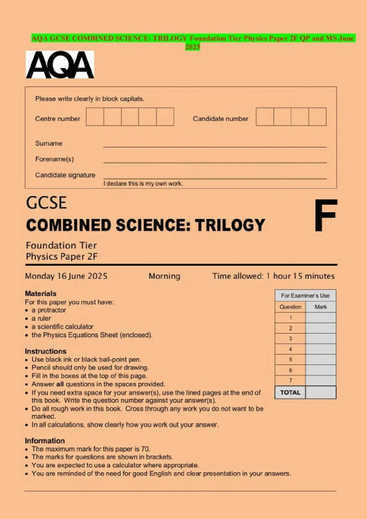 AQA GCSE COMBINED SCIENCE: TRILOGY Foundation Tier Physics Paper 2F QP and MS June 2025