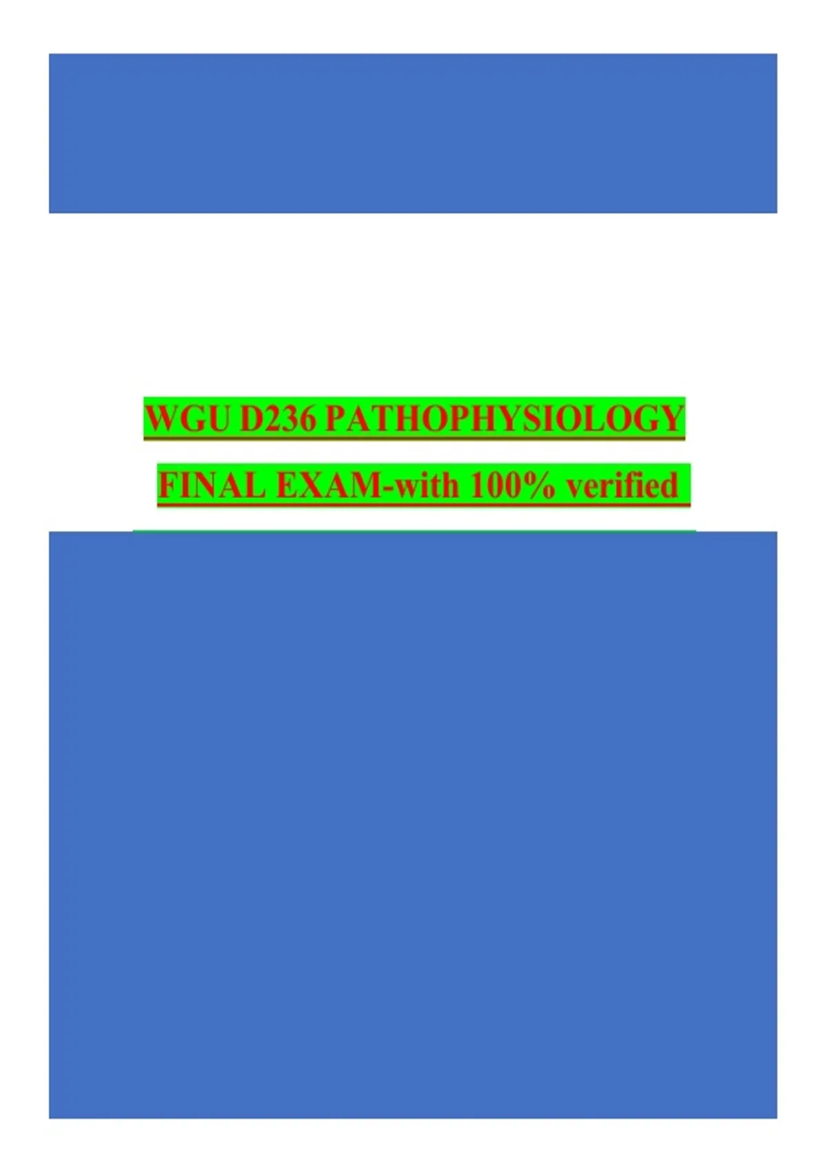 This document contains the complete WGU D236 Pathophysiology final exam material, including exam-style questions with fully verified and accurate answers. It covers all major course domains such as cardiovascular, renal, respiratory, endocrine, neurological, immune, and metabolic pathophysiology, making it ideal for final exam preparation and review.