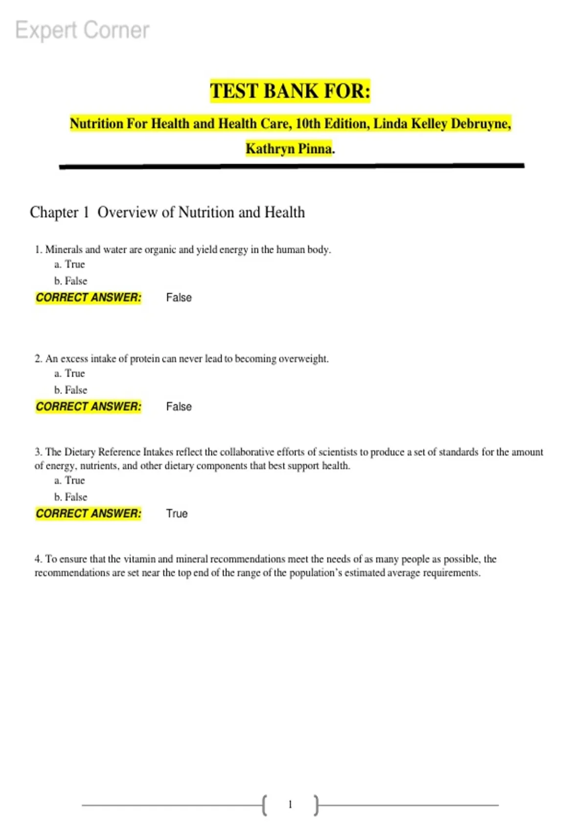 Complete Test Bank – Nutrition for Health and Health Care (8th Edition, MindTap) by DeBruyne & Pinna | NCLEX-Style Questions, Applied Nutrition & Exam-Ready Rationales | ISBN-13: 978-0357730317