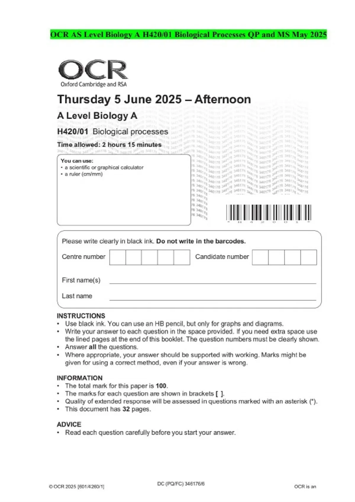 OCR AS Level Biology A H420/01 Biological Processes QP and MS May 2025