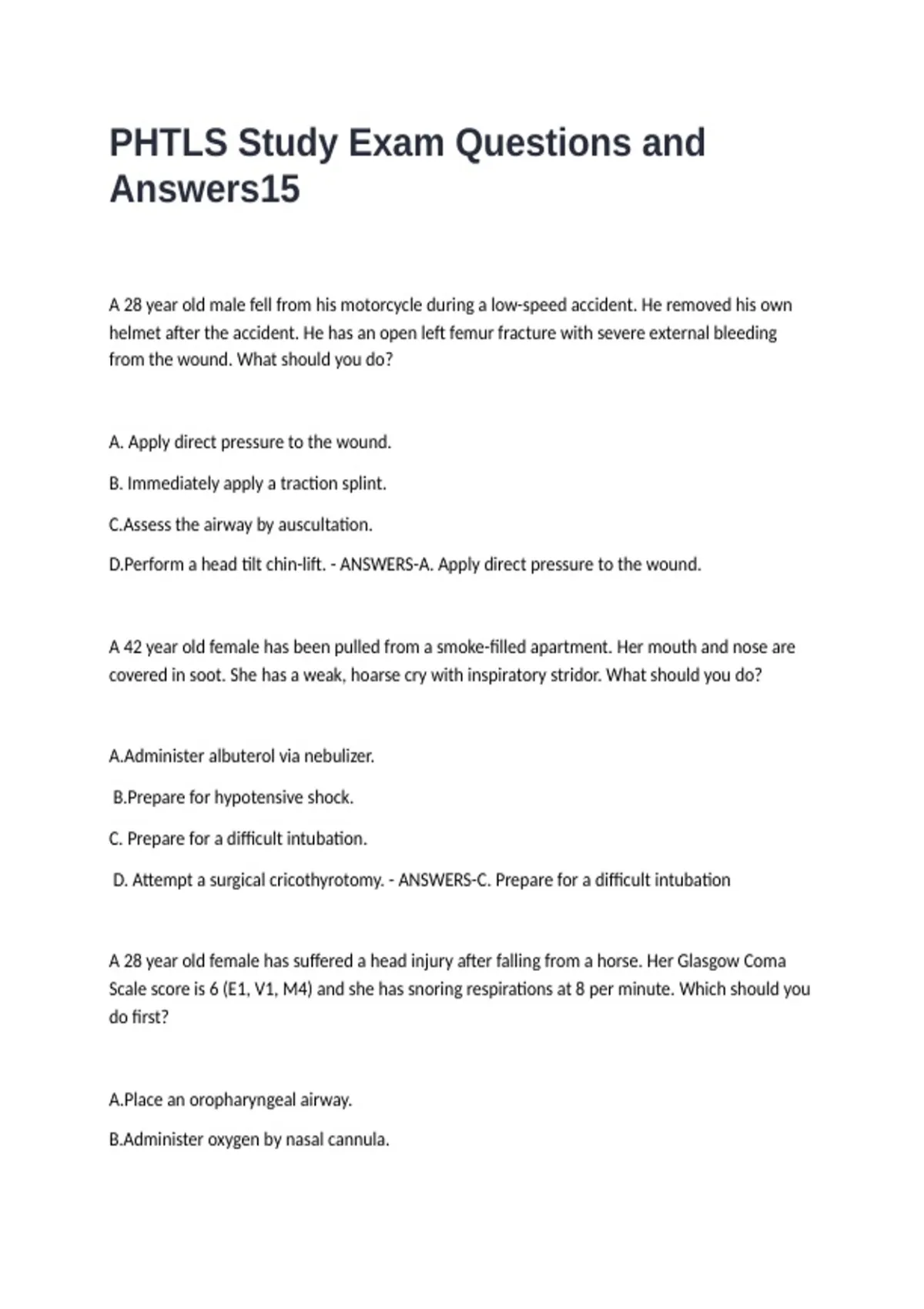 PHTLS Study Exam Questions and Answers