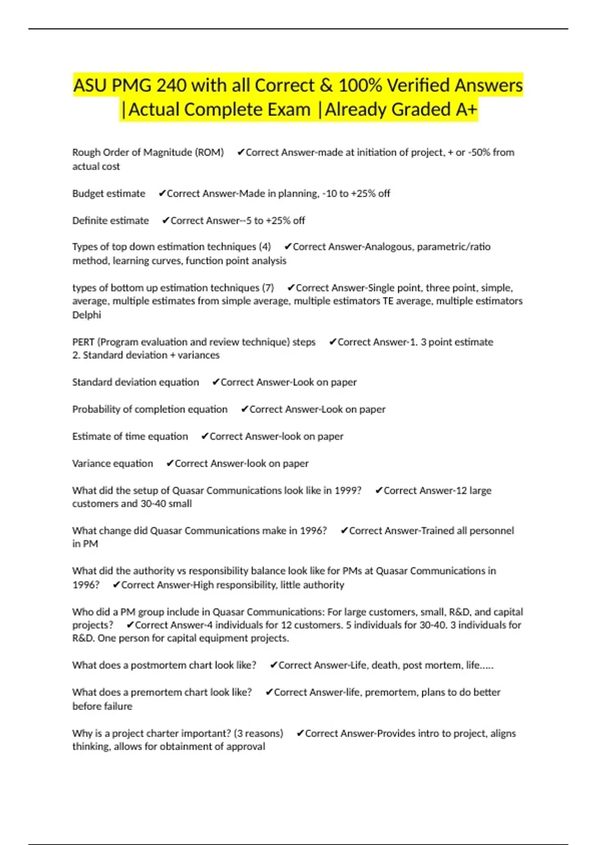 Rough Order of Magnitude (ROM) ✔Correct Answer-made at initiation of project, + or -50% from