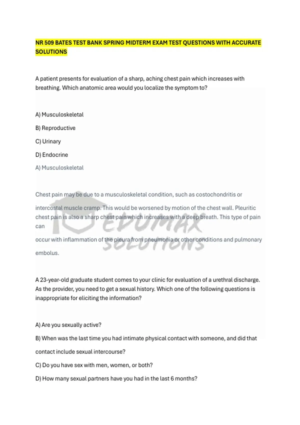 NR 509 BATES TEST BANK SPRING MIDTERM EXAM TEST QUESTIONS WITH ACCURATE