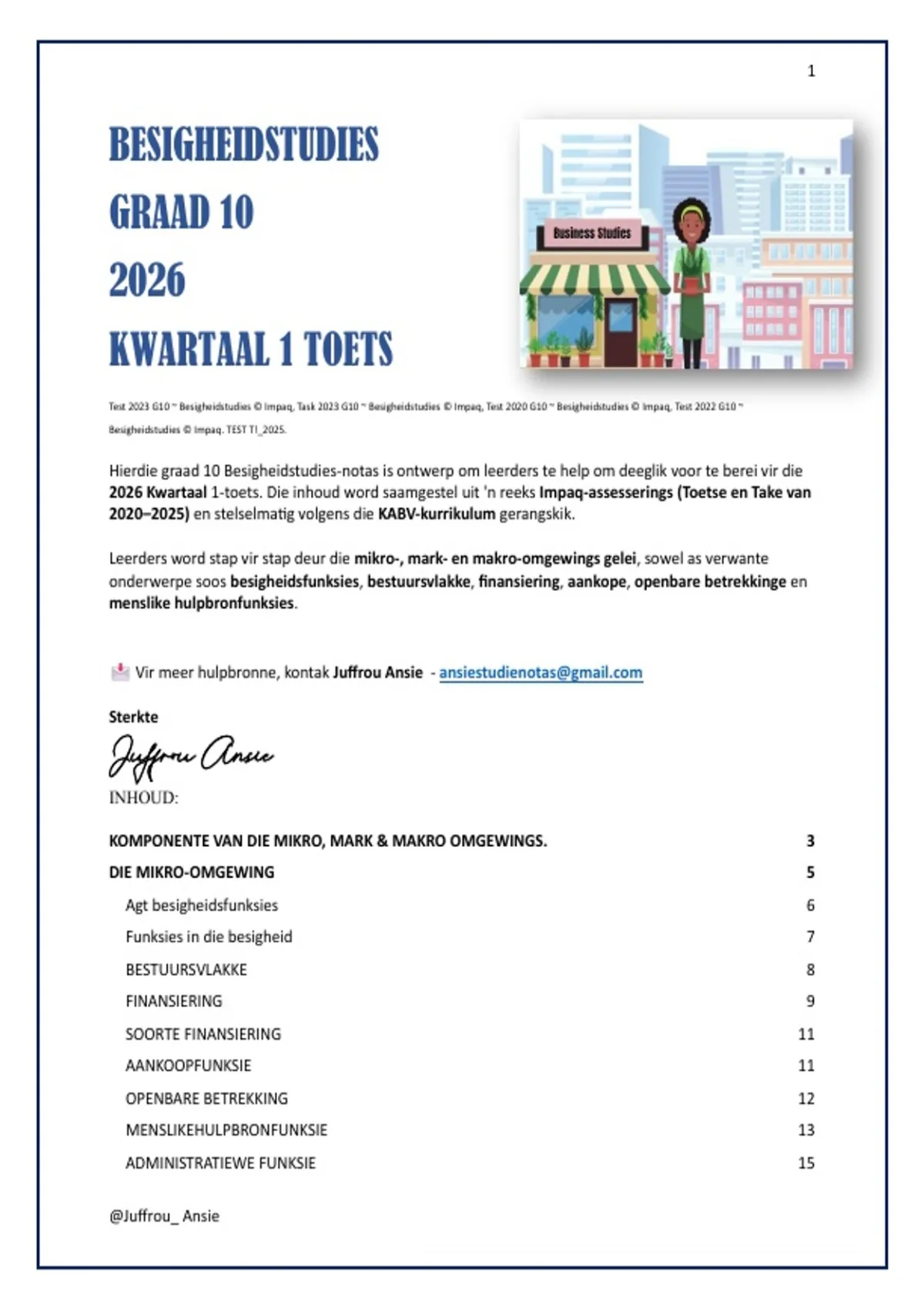 Hierdie graad 10 Besigheidstudies-notas is ontwerp om leerders te help om deeglik voor te berei vir die 2026 Kwartaal 1-toets. Die inhoud word saamgestel uit 'n reeks Impaq-assesserings (Toetse en Take van 2020–2025) en stelselmatig volgens die KABV-kurrikulum gerangskik. Leerders word stap vir stap deur die mikro-, mark- en makro-omgewings gelei, sowel as verwante onderwerpe soos besigheidsfunksies, bestuursvlakke, finansiering, aankope, openbare betrekkinge en menslike hulpbronfunksies.