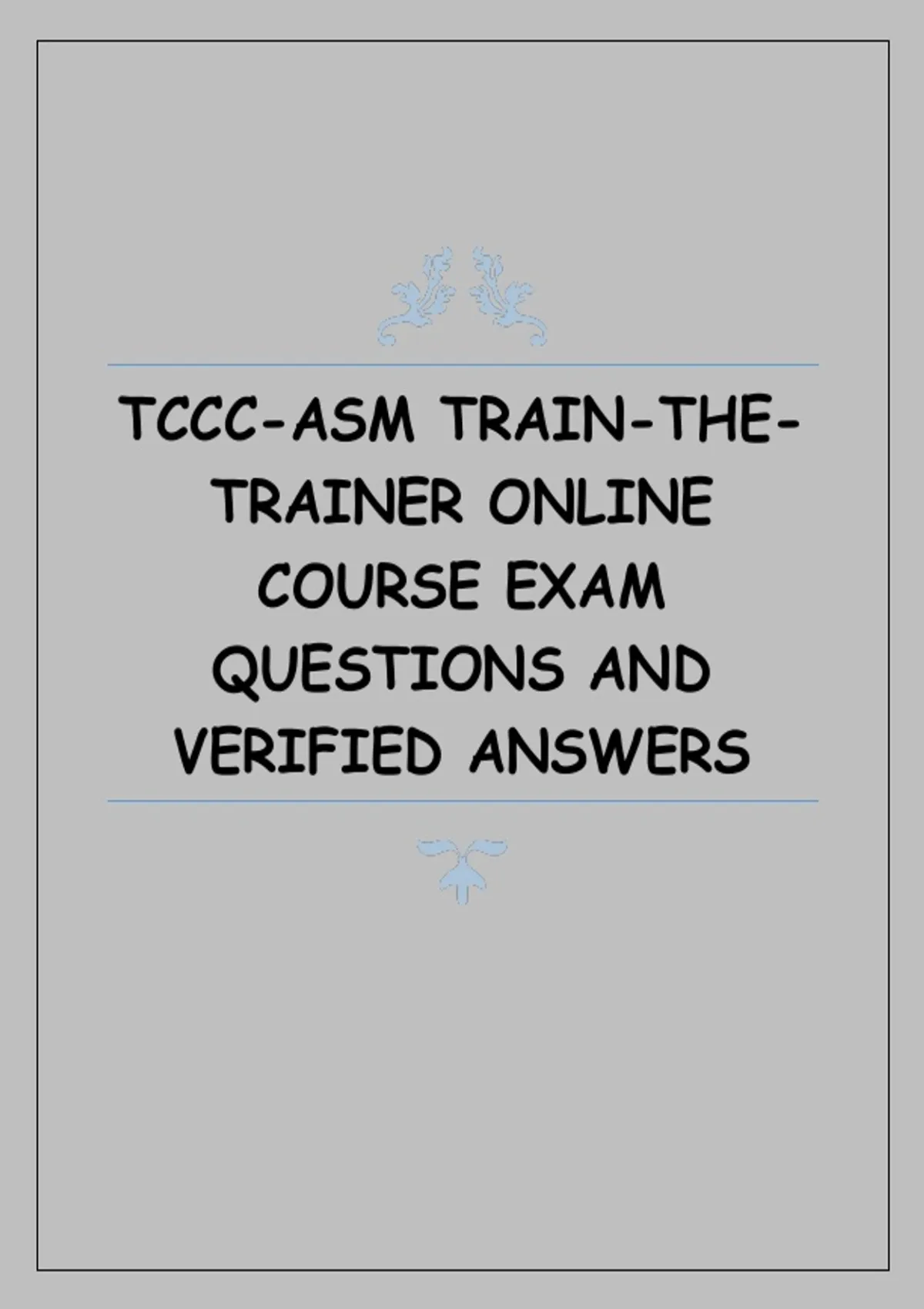 This document includes exam-style questions and verified answers for the TCCC-ASM Train-the-Trainer online course. It focuses on instructional principles, current TCCC-ASM guidelines, and applied Tactical Combat Casualty Care knowledge required to successfully complete the trainer certification exam.
