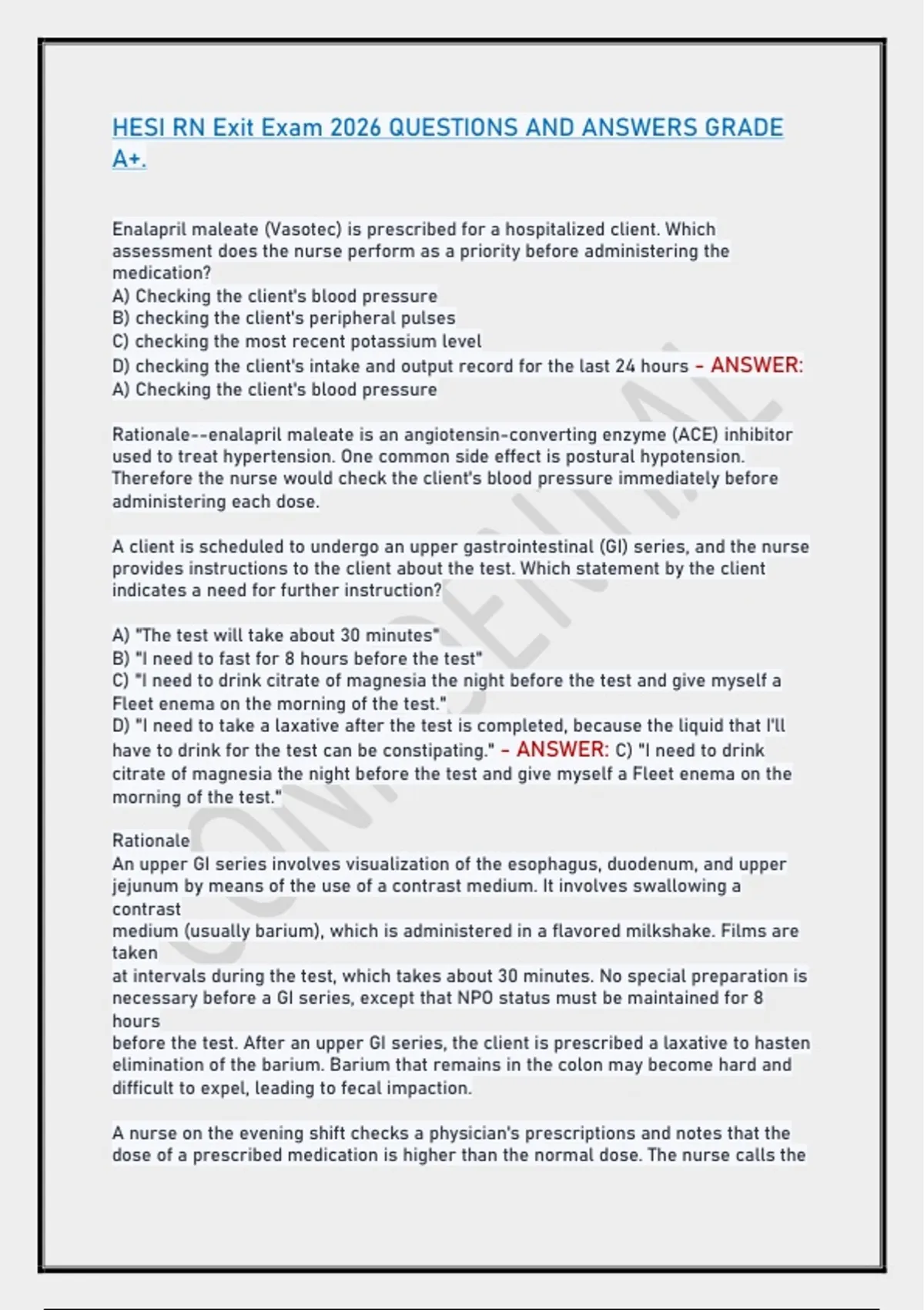 HESI RN Exit Exam 2026 QUESTIONS AND ANSWERS GRADE