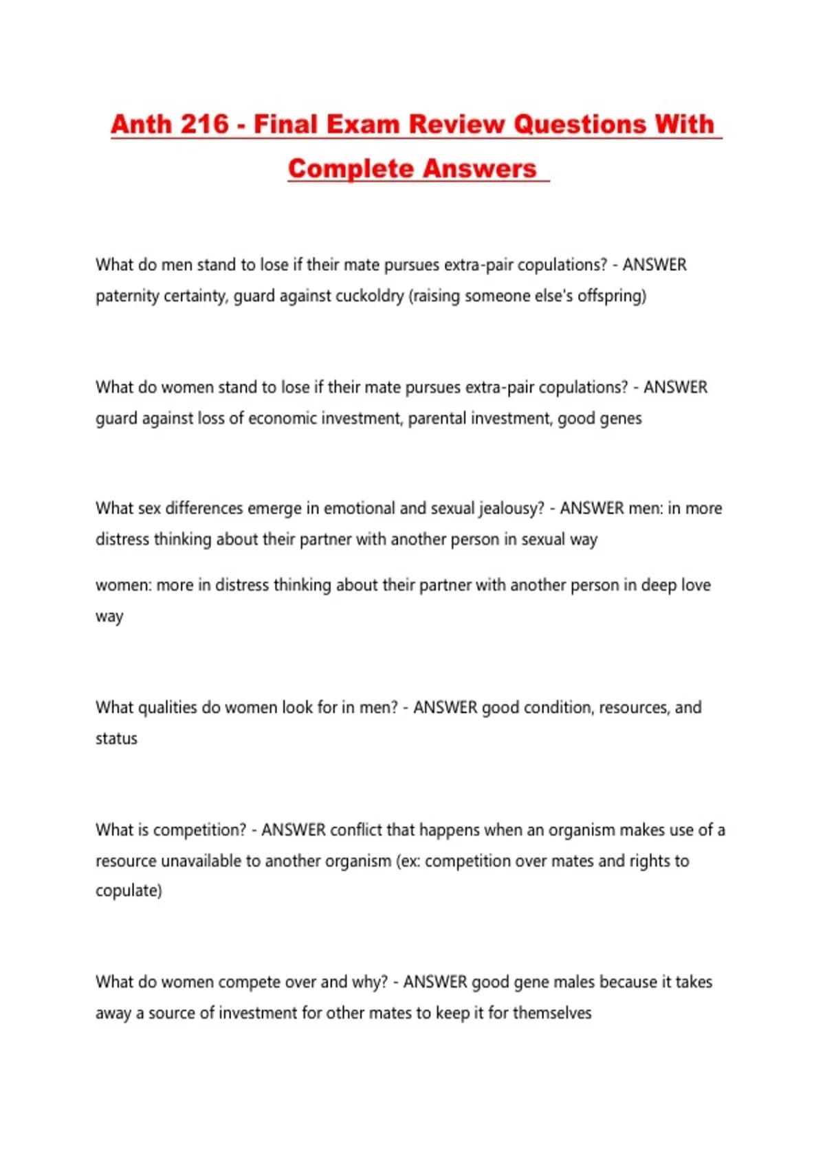Anth 216 - Final Exam Review Questions With Complete Answers ...
