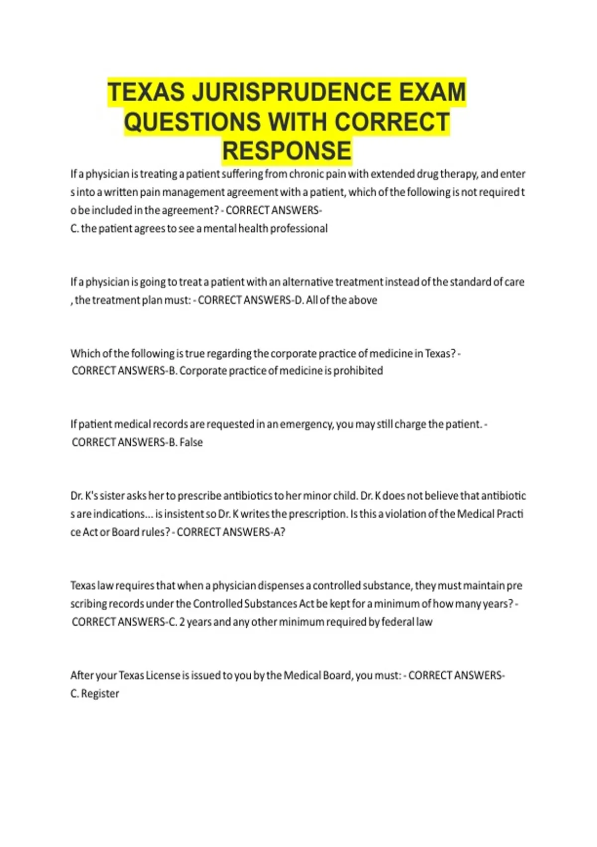 TEXAS JURISPRUDENCE EXAM QUESTIONS WITH CORRECT RESPONSE