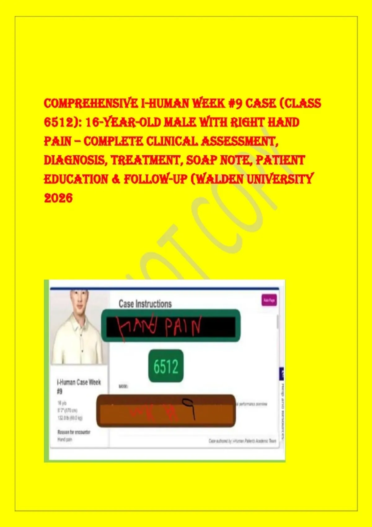 Comprehensive i-Human Week #9 Case (Class 6512): 16-Year-Old Male with Right Hand Pain – Complete Clinical Assessment, Diagnosis, Treatment, SOAP Note, Patient Education & Follow-Up (Walden University 2026