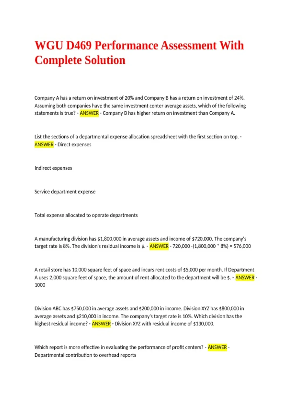highest residual income? - ANSWER - Division XYZ with residual income of $130,000.