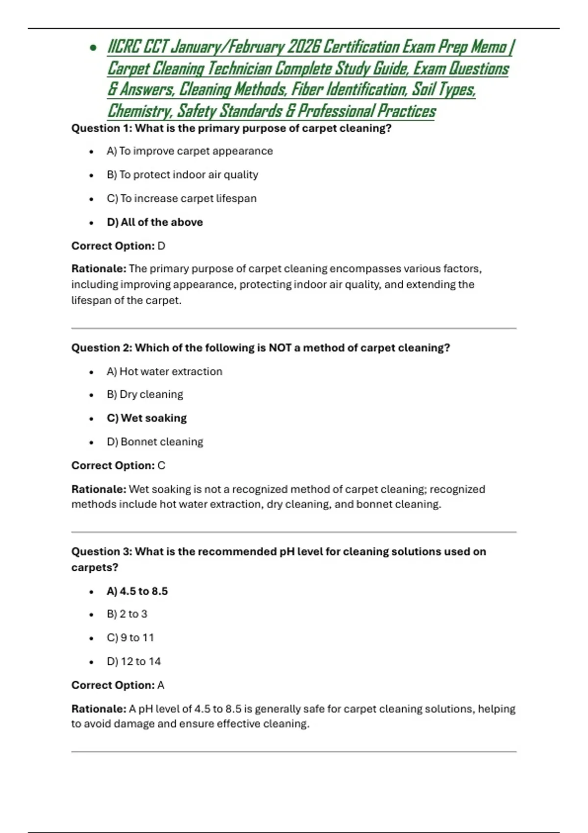 IICRC CCT January/February 2026 Certification Exam Prep Memo | Carpet Cleaning Technician Complete Study Guide, Exam Questions & Answers, Cleaning Methods, Fiber Identification, Soil Types, Chemistry, Safety Standards & Professional Practices