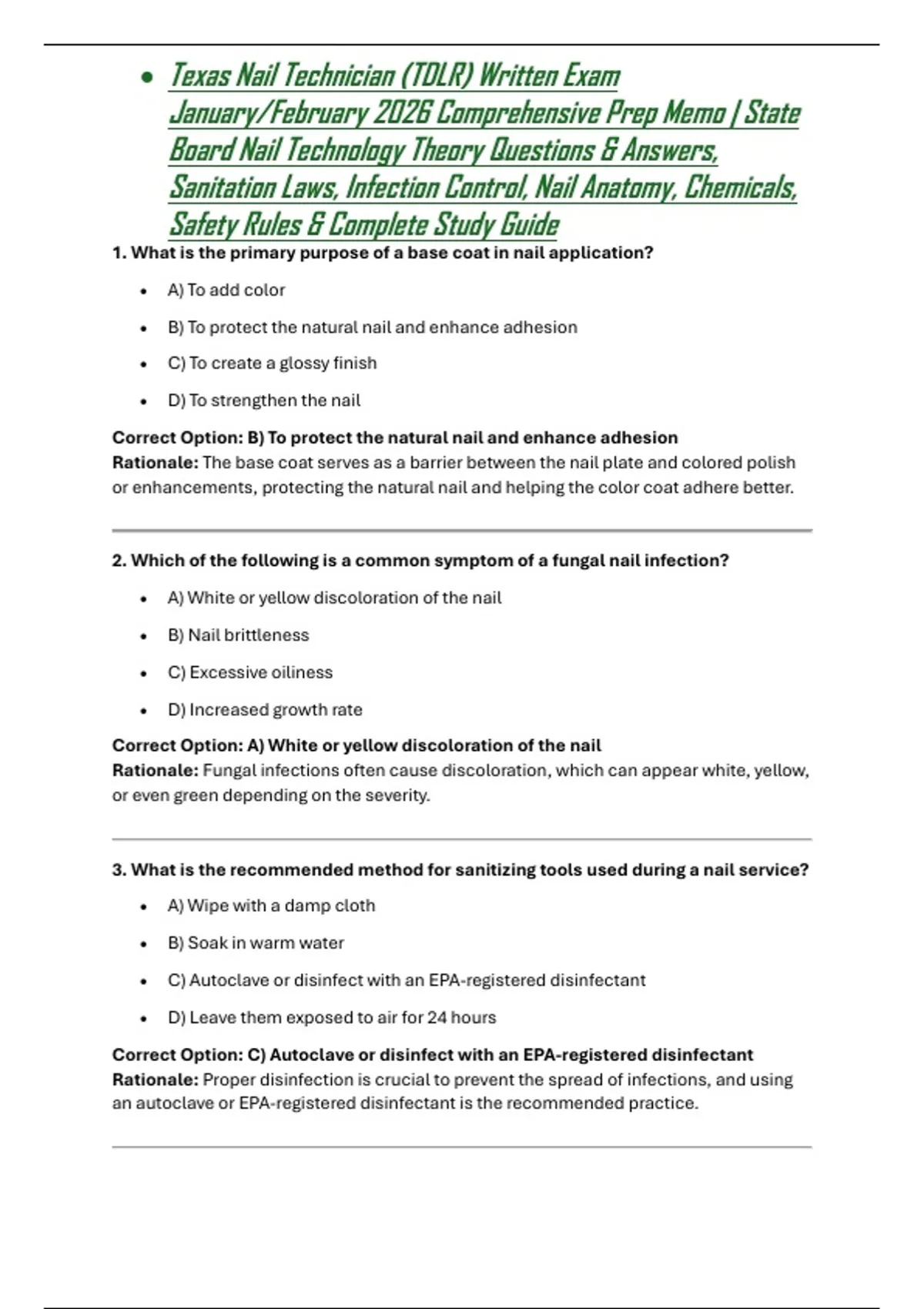 Texas Nail Technician (TDLR) Written Exam January/February 2026 Comprehensive Prep Memo | State Board Nail Technology Theory Questions & Answers, Sanitation Laws, Infection Control, Nail Anatomy, Chemicals, Safety Rules & Complete Study Guide