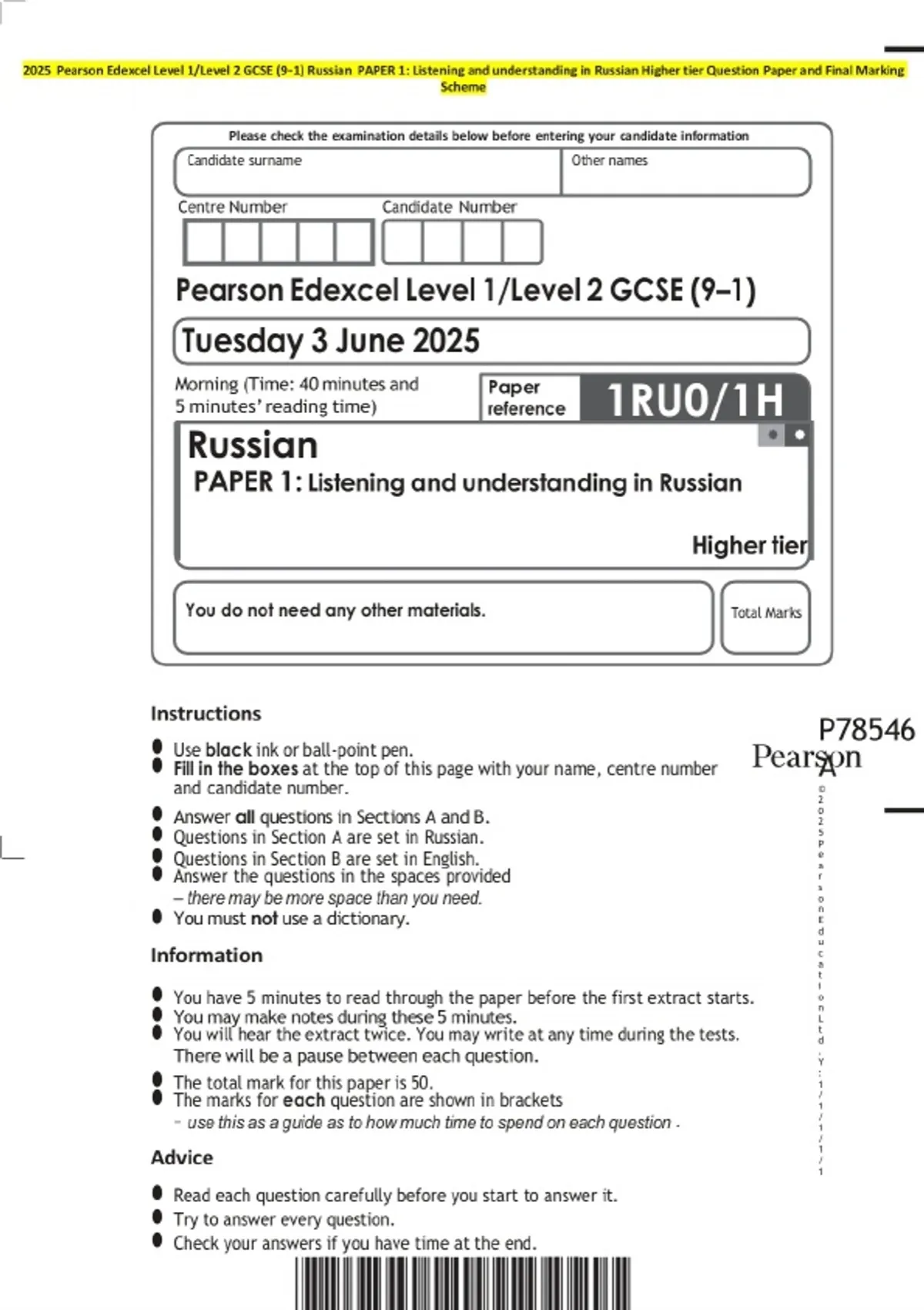 2025 Pearson Edexcel Level 1/Level 2 GCSE (9–1) Russian PAPER 1: Listening and understanding in Russian Higher tier Exam Paper and marking scheme