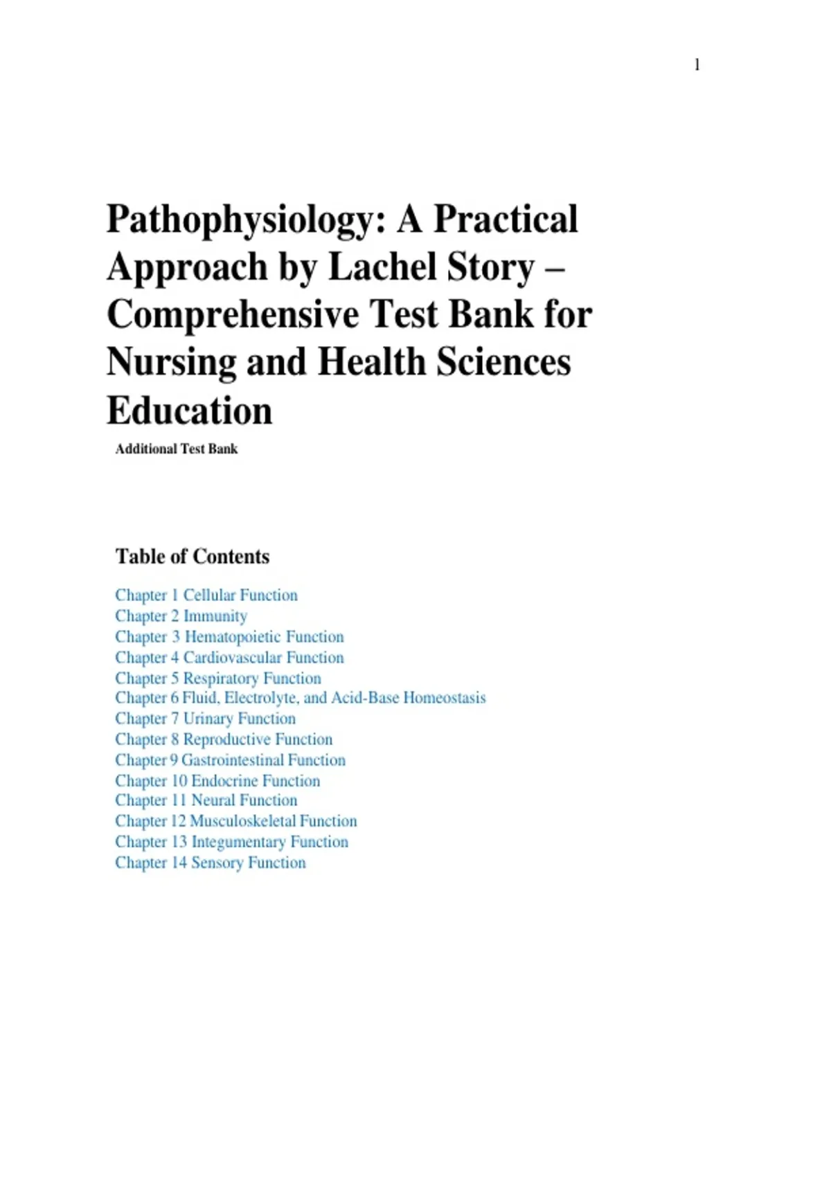 This comprehensive test bank supports Pathophysiology: A Practical Approach by Lachel Story, tailored for nursing and health sciences education. It includes verified, chapter-by-chapter questions and answers designed to reinforce key pathophysiology concepts and terminology. Topics span cellular responses, inflammation and repair, fluid and electrolyte imbalances, immune system disorders, cardiovascular, respiratory, renal, gastrointestinal, endocrine, neurological and musculoskeletal pathologies, cancer biology, and multisystem disorders. Questions reflect clinical scenarios and critical thinking applications to help nursing and allied health students prepare for exams, quizzes, and clinical assessments. Organized for efficient study and aligned with the textbook’s learning objectives, this resource enhances understanding of disease processes, diagnostic reasoning, and evidence-based patient care.
