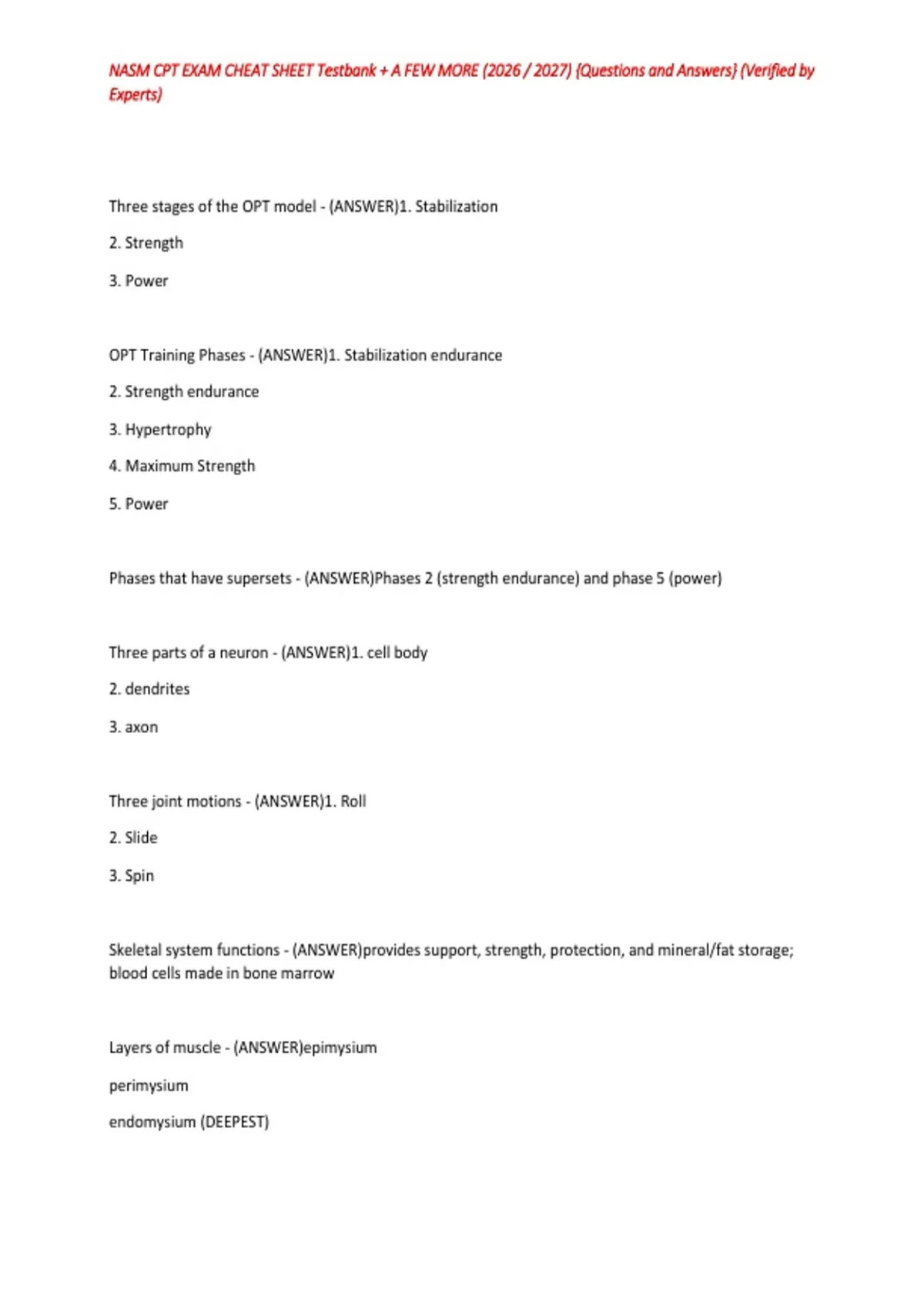 , NASM CPT EXAM CHEAT SHEET Testbank + A FEW MORE () {Questions and Answers} (Verified by