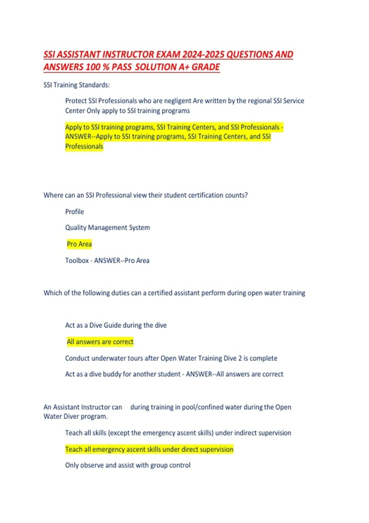 SSI ASSISTANT INSTRUCTOR EXAM QUESTIONS AND ANSWERS 100 % PASS SOLUTION A+ GRADE