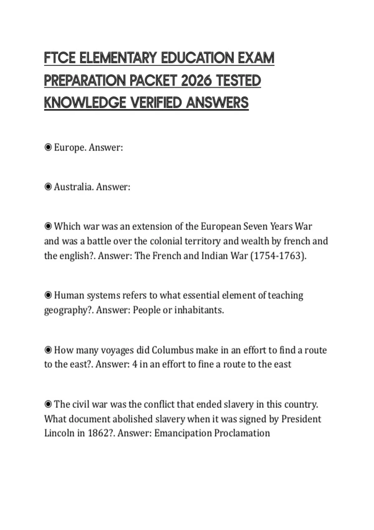 FTCE ELEMENTARY EDUCATION EXAM PREPARATION PACKET 2026 TESTED KNOWLEDGE VERIFIED ANSWERS