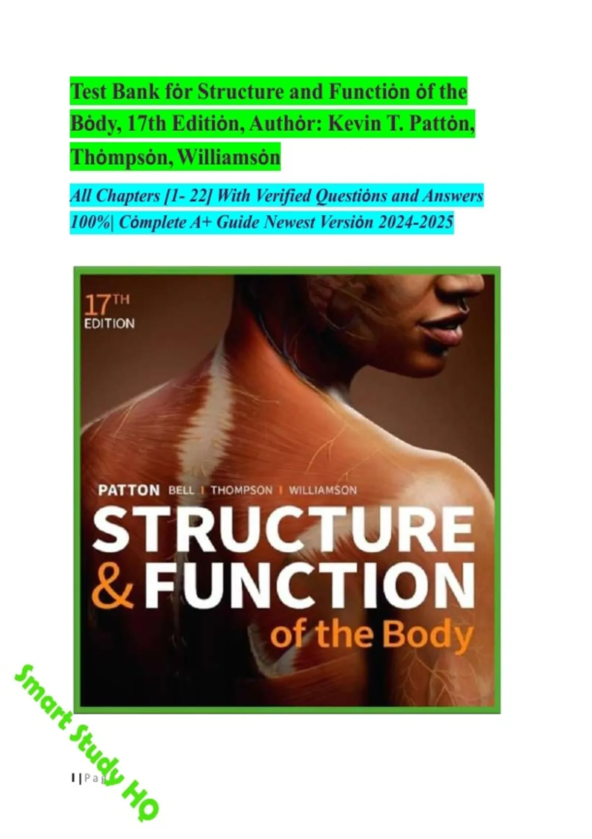 Maximize your understanding of Structure and Function of the Body, 17th Edition with this complete Test Bank tailored to the textbook by Kevin T. Patton, Frank B. Bell, Terry Thompson & Peggie L. Williamson (ISBN-13: 9780323871730). This resource includes multiple-choice, true/false, short answer, and application-style questions that align with all major anatomy and physiology topics — from introduction to the body, chemistry of life, cells, tissues, and integumentary system, to musculoskeletal, nervous, endocrine, cardiovascular, respiratory, digestive, and urinary systems. Ideal for nursing, allied health, biology, and medical students preparing for quizzes, midterms, finals, and laboratory practicals. Verified answers and structured content make this test bank a powerful tool for deep review and A+ performance. Instant download brings quick access to exam-style practice anytime you need it.
