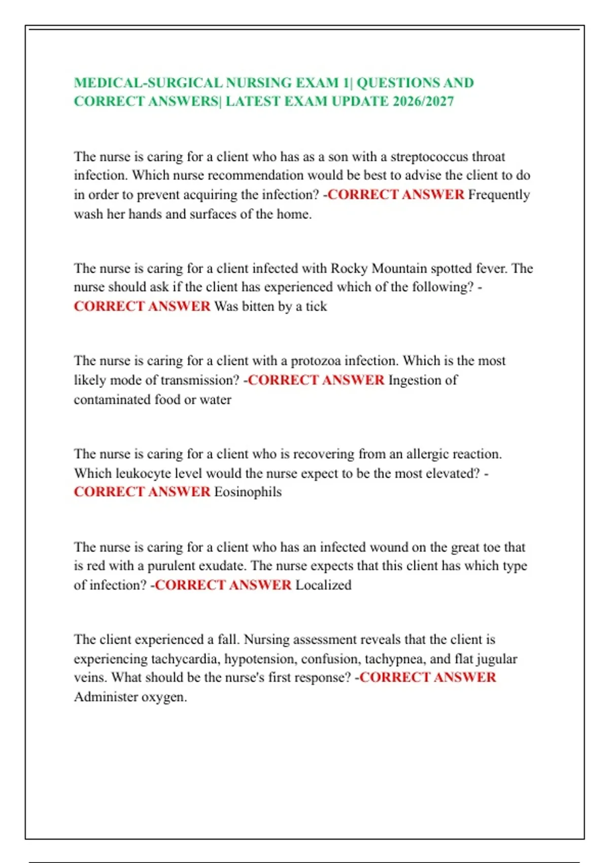 MEDICAL-SURGICAL NURSING EXAM 1| QUESTIONS AND CORRECT ANSWERS| LATEST EXAM UPDATE 2026/2027