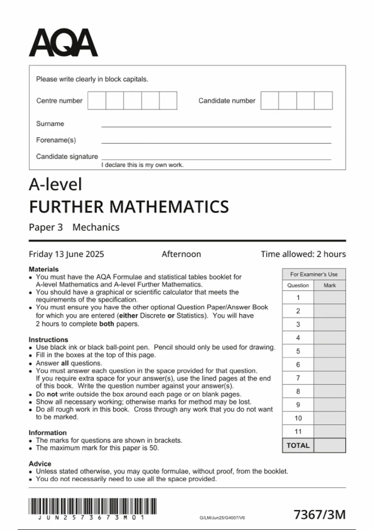 Merged 2025 AQA A Level Further Mathematics Paper 3 and Mark Scheme 7367/3M