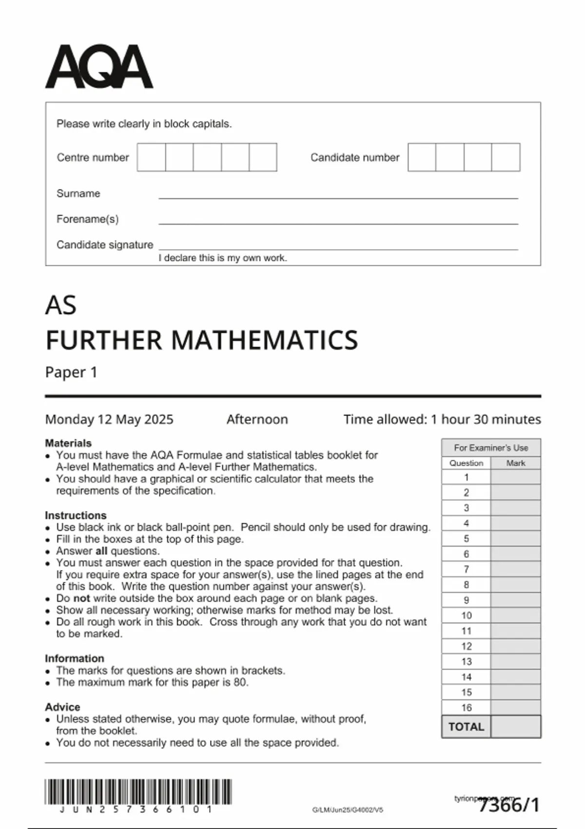 - 2025 AQA AS Level Further Mathematics Paper 1