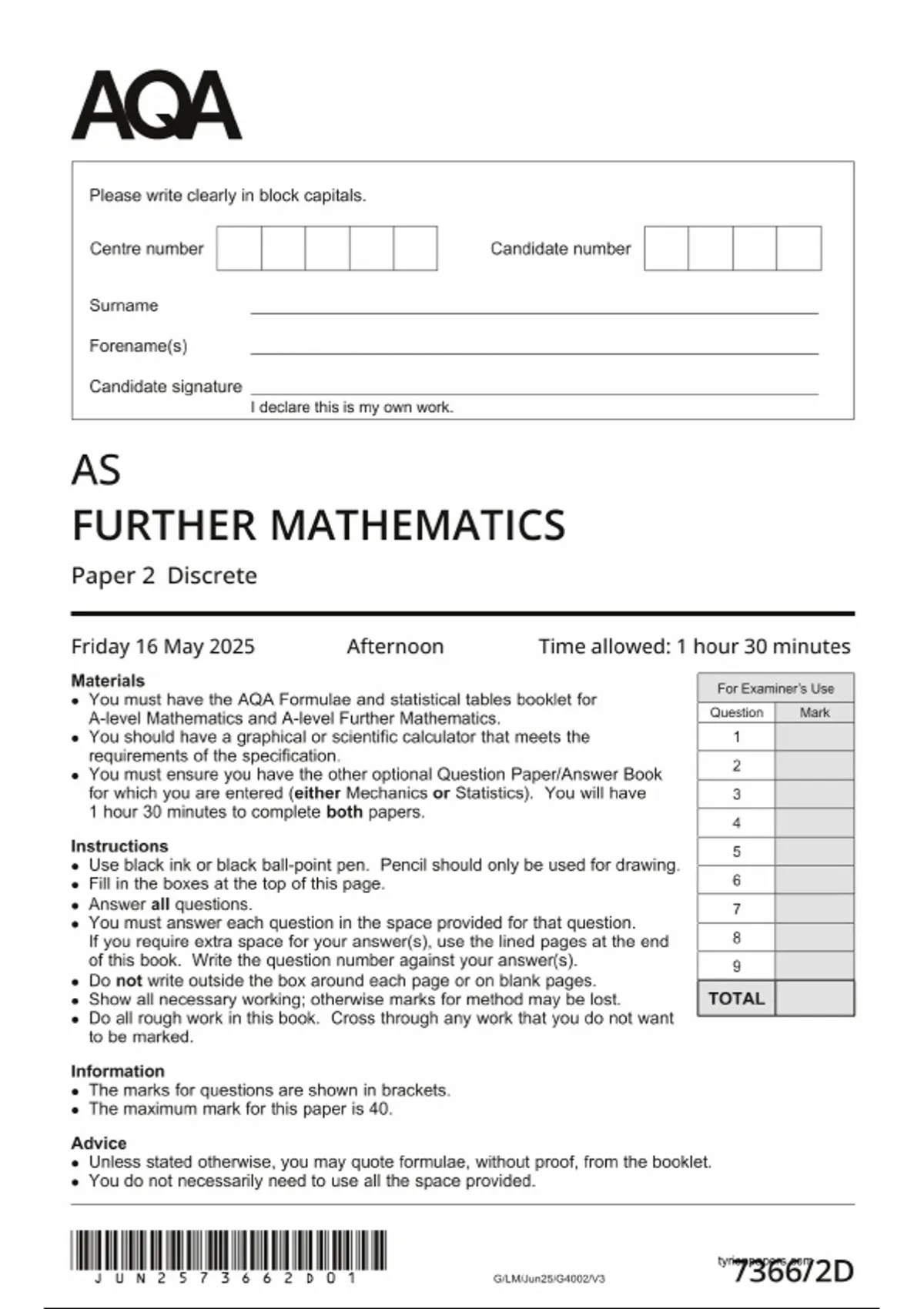 2025 AQA AS Level Further Mathematics Paper 2 (7366/2)