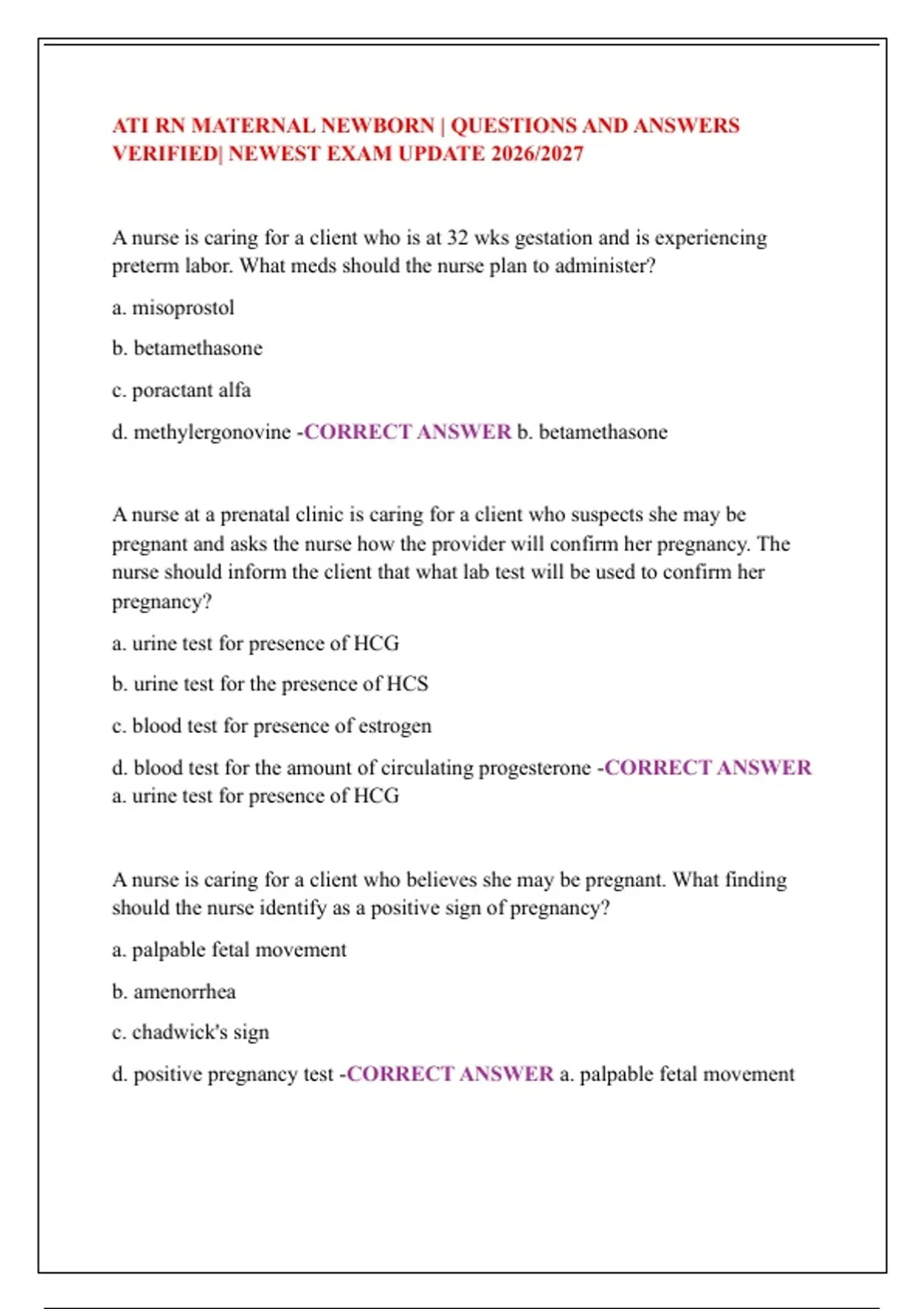 ATI RN MATERNAL NEWBORN | QUESTIONS AND ANSWERS