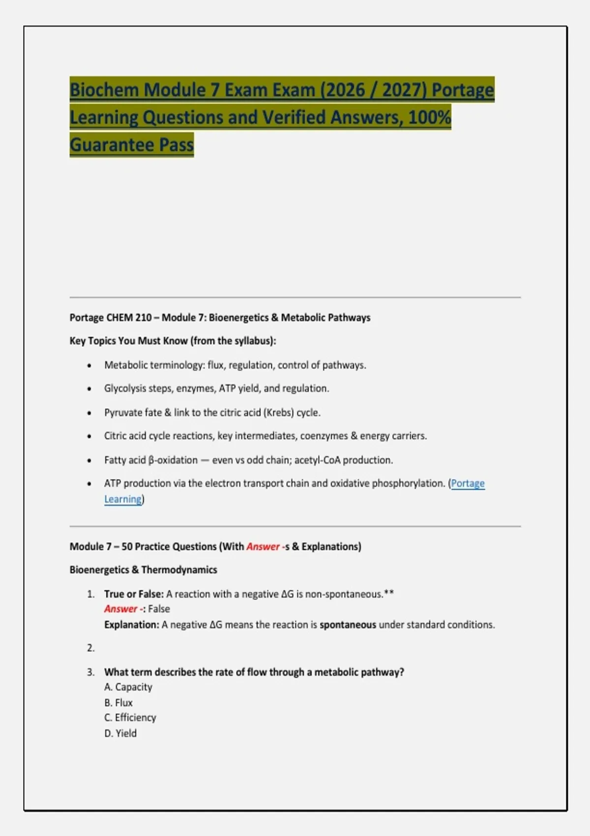 Biochem Module 7 Exam Exam (2026 / 2027) Portage Learning Questions and Verified Answers, 100% Guarantee Pass