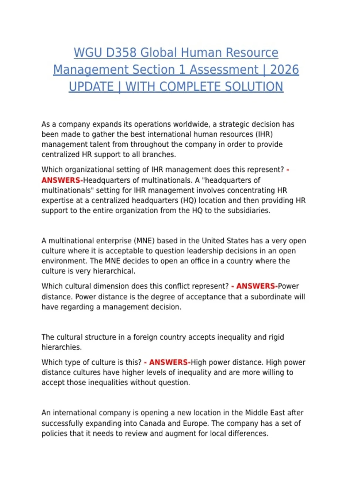 This document provides a comprehensive review of the WGU D358 Global Human Resource Management Section 1 Assessment for 2026, featuring exam-style questions with fully verified, step-by-step solutions. It is designed to help students prepare effectively, reinforce key HRM concepts, and achieve top grades in the course. All questions have been carefully solved and reviewed, ensuring alignment with current WGU D358 objectives and assessment standards. The material is ideal for self-study, focused revision, and exam preparation
