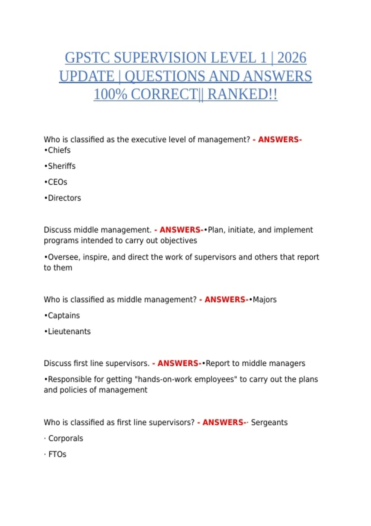 This document provides a comprehensive review of GPSTC Supervision Level 1 for the 2026 update, featuring exam-style questions with fully verified answers. It is designed to help law enforcement trainees and supervisors prepare effectively, reinforce key supervisory concepts, and achieve top performance in their assessments. All questions are carefully solved and reviewed, ensuring alignment with current GPSTC standards, training objectives, and typical assessment formats. The material is ideal for self-study, revision, and exam preparation.