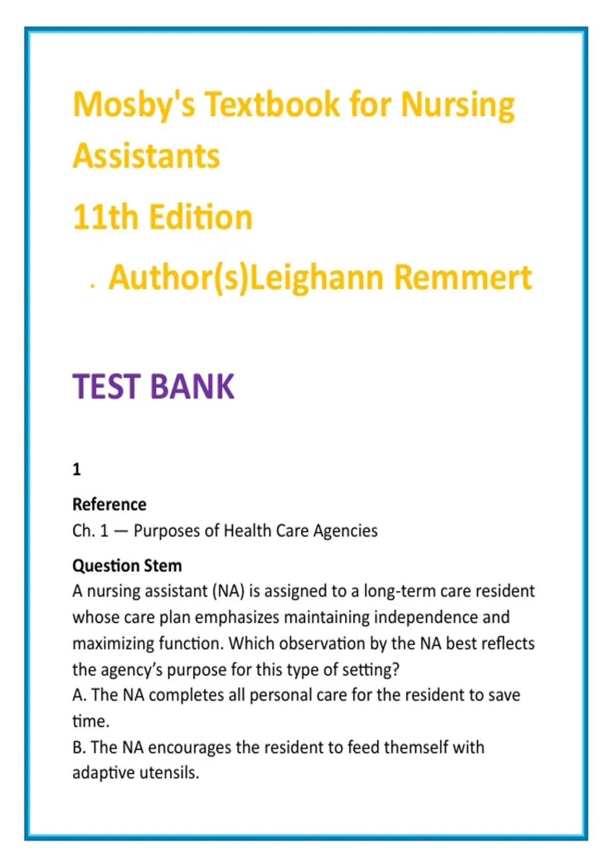 Mosby’s Nursing Assistant Test Bank 2026 | CNA Practice Questions & Nursing Test Bank | Remmert MCQs Study Guide 2) SEO Product Description (200–300 words) Prepare with confidence using this comprehensive Mosby’s Nursing Assistant Test Bank, built directly from Mosby’s Textbook for Nursing Assistants, 11th Edition by Leighann Remmert—a gold-standard resource in CNA education. This nursing test bank 2026 delivers full textbook coverage across ALL units and chapters, with 20 high-quality, entry-level clinical MCQs per chapter. Every question is scenario-based, scope-appropriate, and designed to strengthen clinical judgment, safety awareness, and CNA exam readiness. Each item includes clear, evidence-based rationales that explain not just what the correct answer is, but why—helping learners reinforce safe practice, proper delegation, infection control, patient dignity, and effective communication within the nursing assistant role. This nursing assistant study guide is ideal for structured review, skills-lab preparation, OSCE practice, and final exam readiness. It saves time, reduces test anxiety, and builds confidence for real-world patient care. What’s included: FULL chapter-by-chapter coverage of Mosby’s Textbook for Nursing Assistants (11th Edition) 20 CNA-level MCQs per chapter with verified correct answers Detailed rationales aligned with CNA scope of practice Scenario-based questions on safety, hygiene, mobility, nutrition, infection control, and ethics Optimized for CNA exams, PCT programs, and entry-level healthcare courses Ideal for: Certified Nursing Assistant (CNA) programs Nursing Assistant / Patient Care Assistant courses Patient Care Technician (PCT) training Long-term care and geriatric care education Entry-level clinical skills and healthcare fundamentals Designed for learners who want accuracy, clarity, and exam-ready confidence—not guesswork. 3) 8 High-Value SEO Keywords Mosby nursing assistant test bank CNA practice questions nursing test bank 2026 nursing assistant study guide Remmert nursing assistant MCQs CNA exam practice test bank patient care technician test bank nursing assistant MCQ questions 4) 10 Hashtags #CNAExamPrep #NursingAssistantTestBank #CNAPracticeQuestions #NursingTestBank2026 #PatientCareTechnician #NursingAssistantStudyGuide #EntryLevelHealthcare #LongTermCareTraining #ClinicalSkillsPractice #HealthcareEducation