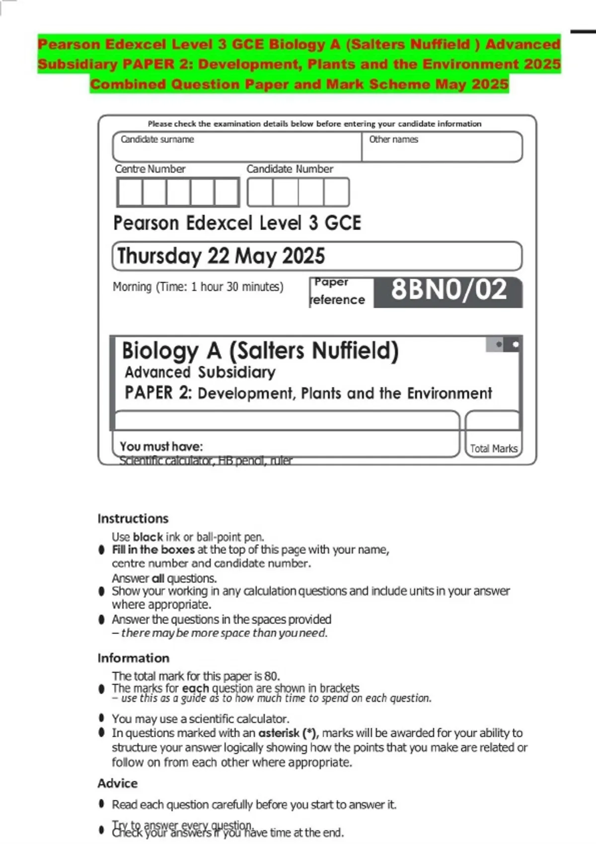 Pearson Edexcel Level 3 GCE Biology A (Salters Nuffield ) Advanced Subsidiary PAPER 2: Development, Plants and the Environment 2025 Combined Question Paper and Mark Scheme May 2025