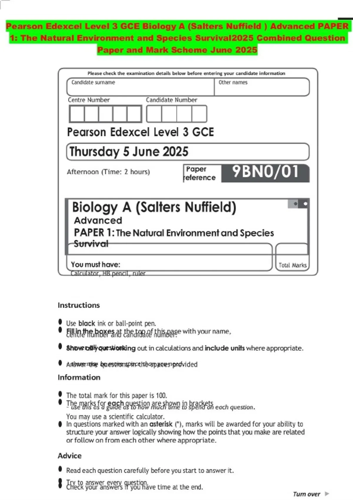 Pearson Edexcel Level 3 GCE Biology A (Salters Nuffield ) Advanced PAPER 1: The Natural Environment and Species Survival2025 Combined Question Paper and Mark Scheme June 2025
