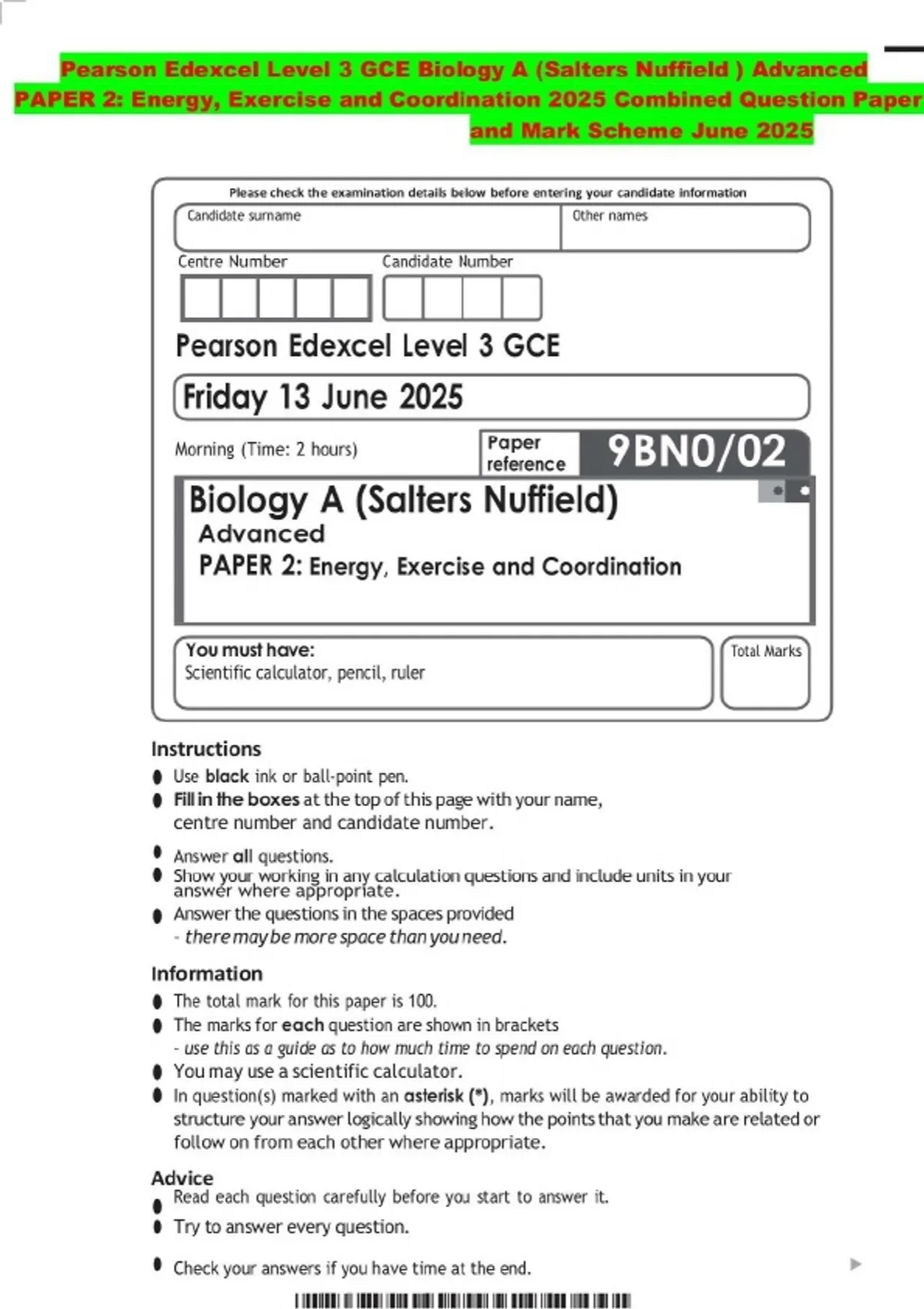 Pearson Edexcel Level 3 GCE Biology A (Salters Nuffield ) Advanced PAPER 2: Energy, Exercise and Coordination 2025 Combined Question Paper and Mark Scheme June 2025