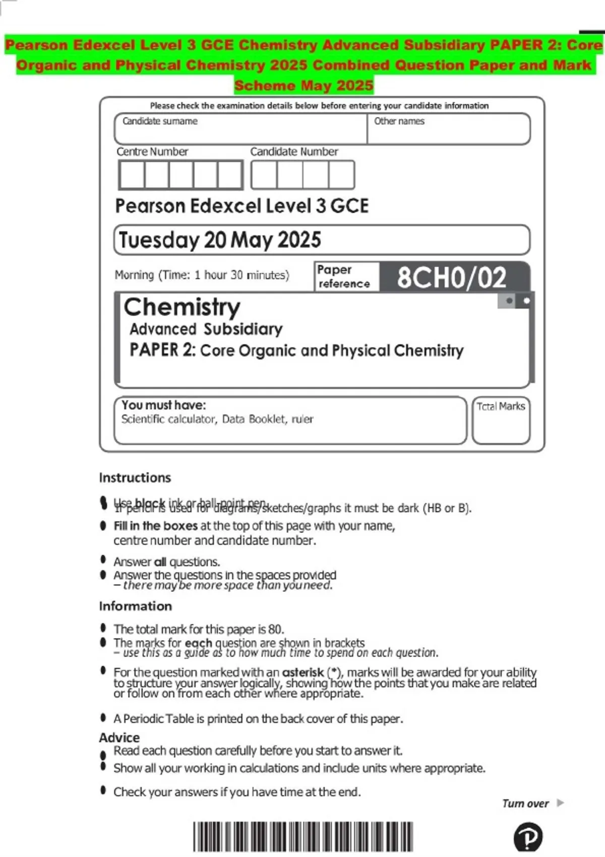 BUNDLE:::Pearson Edexcel Level 3 GCE Chemistry 2025 Combined Question Paper and Mark Scheme