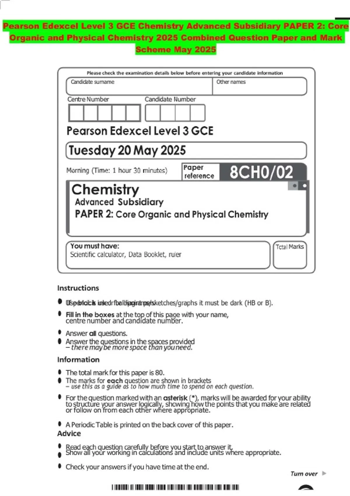 BUNDLE:::Pearson Edexcel Level 3 GCE Chemistry 2025 Combined Question Paper and Mark Scheme