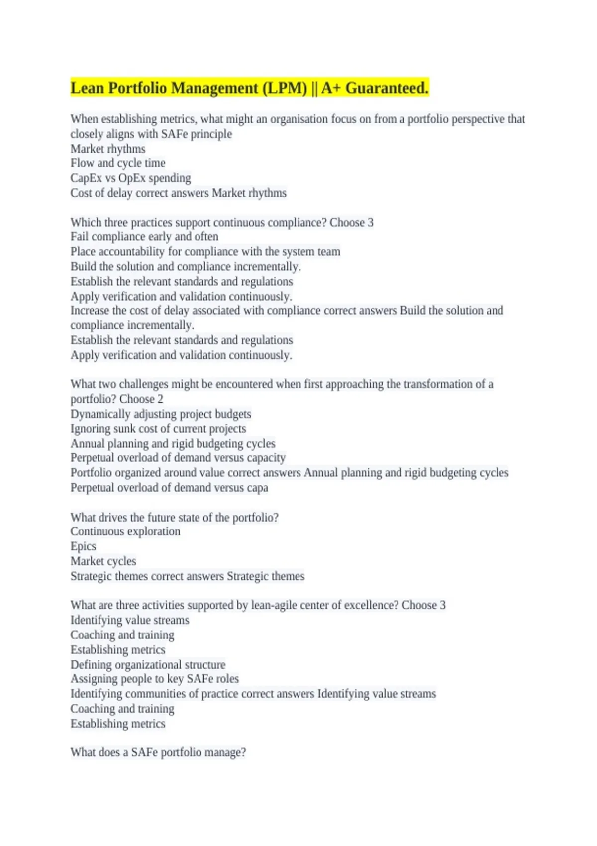 Finance, enterprise executives, and lean portfolio management fiduciaries correct answers