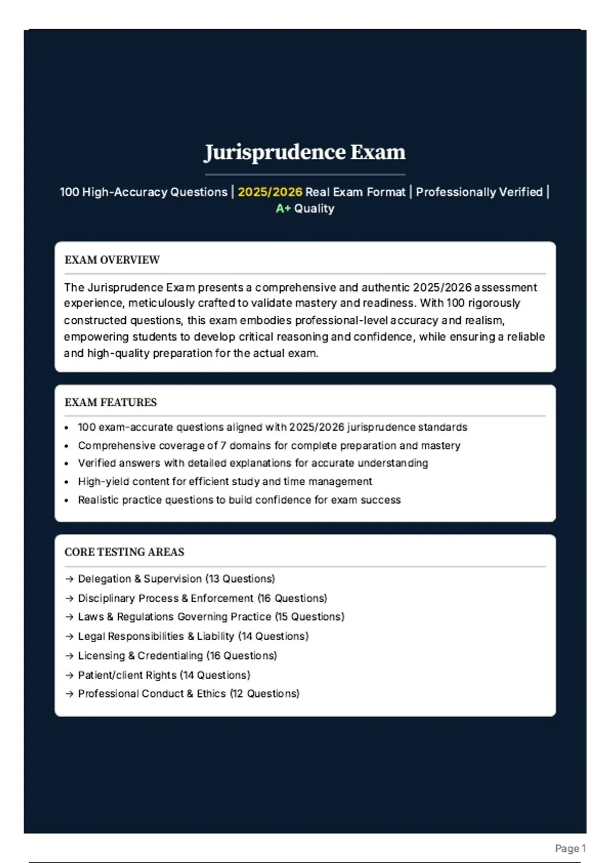 This exam bank contains 100 high-accuracy questions tailored specifically for a Jurisprudence or Professional Ethics exam. Designed to match the real exam format, all questions are professionally verified and meet an A+ quality standard. It is the ideal preparation tool for law students, bar candidates, or professionals in regulated fields (such as healthcare, engineering, or real estate) seeking to master the legal principles, rules, and ethical standards governing their profession with confidence.