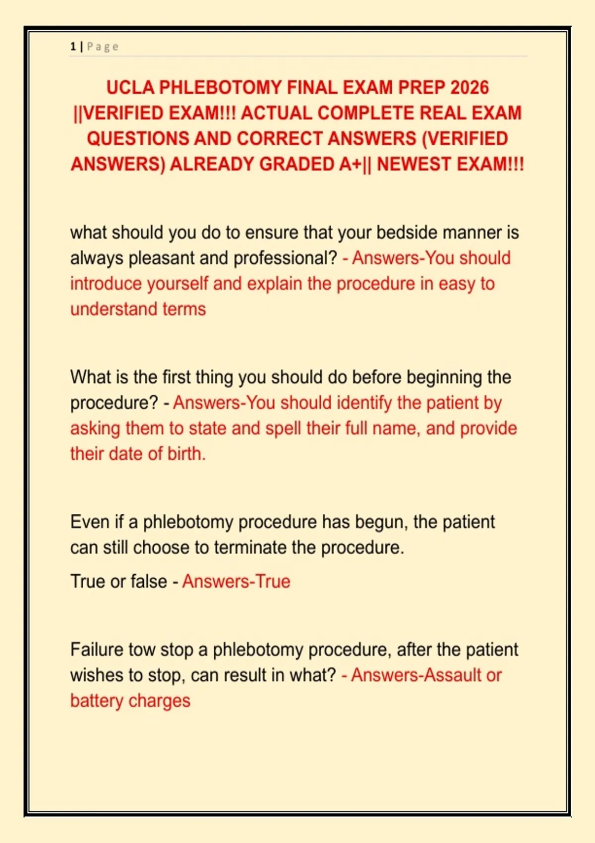 UCLA PHLEBOTOMY FINAL EXAM PREP 2026 ||VERIFIED EXAM!!! ACTUAL COMPLETE REAL EXAM QUESTIONS AND CORRECT ANSWERS (VERIFIED ANSWERS) ALREADY GRADED A+|| NEWEST EXAM!!!