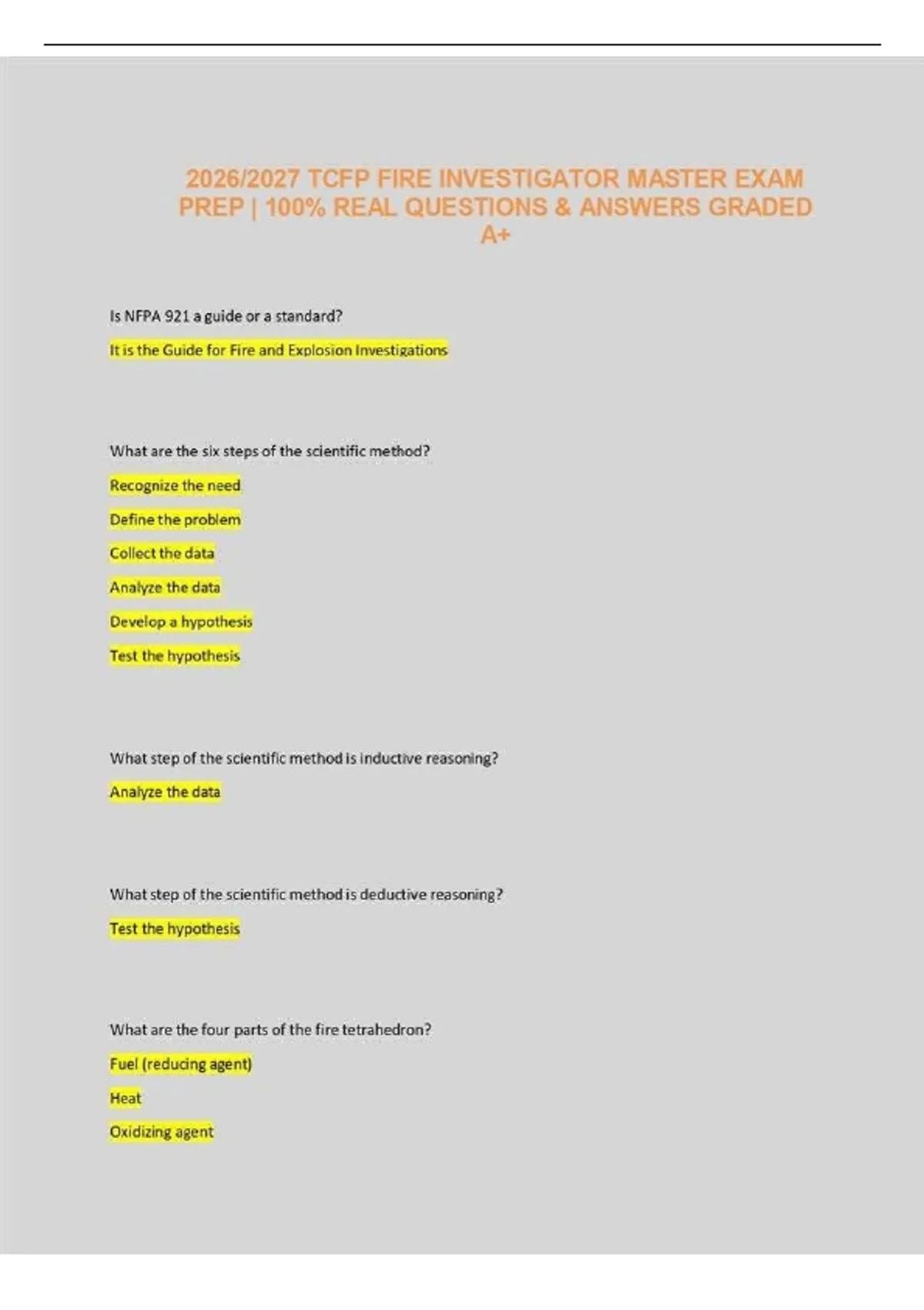 This document is a comprehensive study resource designed for individuals preparing for the Texas Commission on Fire Protection (TCFP) Fire Investigator certification. It typically functions as a "master" test bank, providing a collection of high-probability questions and verified answers that align with the state’s curriculum and NFPA 921/1033 standards. Product Description Title: Fire Investigator – Master for TCFP Test (Graded A Questions & Answers) Overview: This study guide is a high-yield preparation tool specifically tailored for the TCFP Fire Investigator exam. It condenses complex investigative principles into an easy-to-digest question-and-answer format, ensuring candidates can master the technical knowledge required to pass the certification on their first attempt. The material is "Graded A," meaning it focuses on the most critical, frequently tested concepts with 100% verified accuracy. Key Features: Comprehensive Coverage: Includes core topics such as the Scientific Method, Fire Dynamics, Origin and Cause Determination, Evidence Collection, and Legal Considerations. NFPA Alignment: Fully updated to reflect the latest editions of NFPA 921 (Guide for Fire and Explosion Investigations) and NFPA 1033 (Standard for Professional Qualifications for Fire Investigator). Exam-Ready Content: Features a "Master" bank of questions that mimic the style and difficulty of the actual TCFP state exam. Technical Deep-Dive: Covers specialized areas like electricity and fire, building construction types, fire patterns (V-patterns, calcination, spalling), and human behavior in fire incidents.
