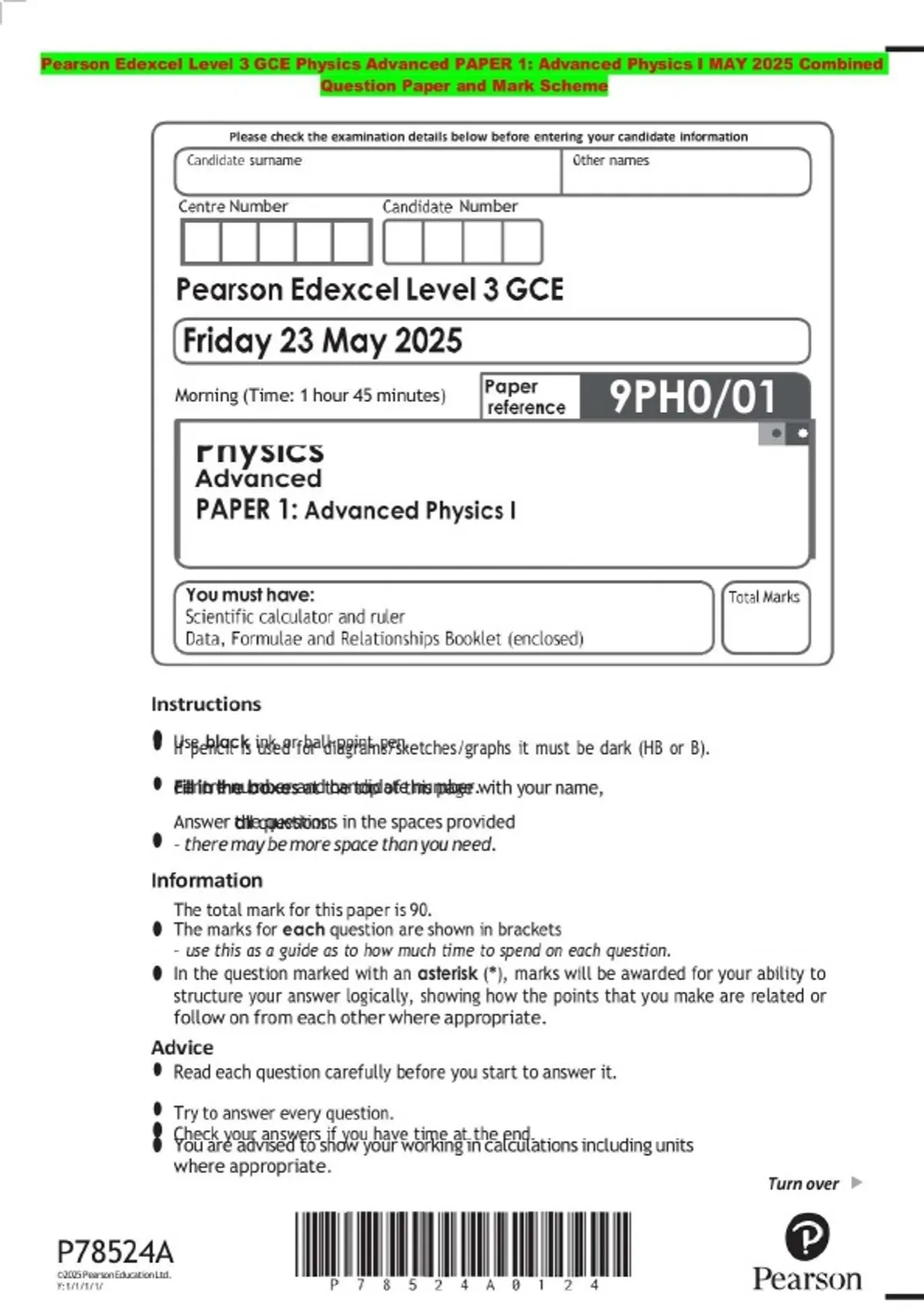 Pearson Edexcel Level 3 GCE Physics Advanced PAPER 1: Advanced Physics I MAY 2025 Combined Question Paper and Mark Scheme
