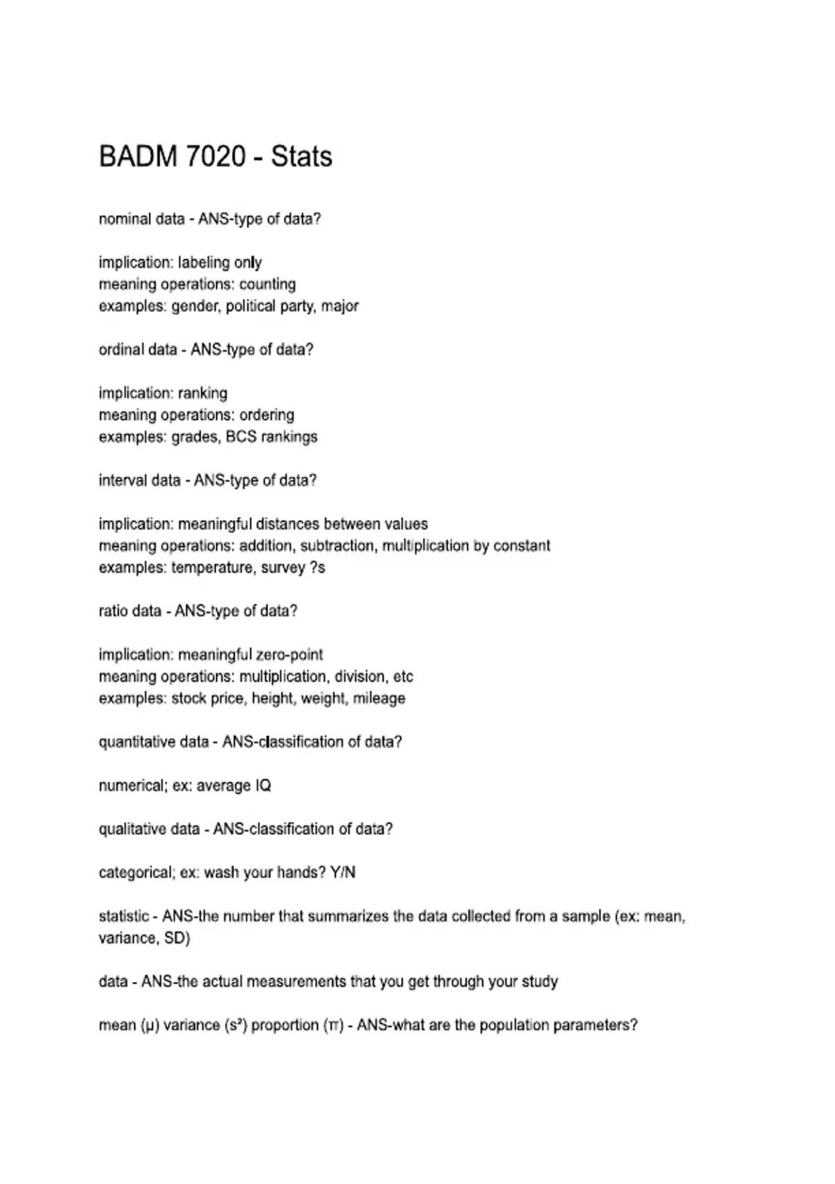 BADM 7020 Statistics Study Guide & Questions 2025/2026